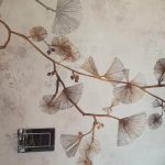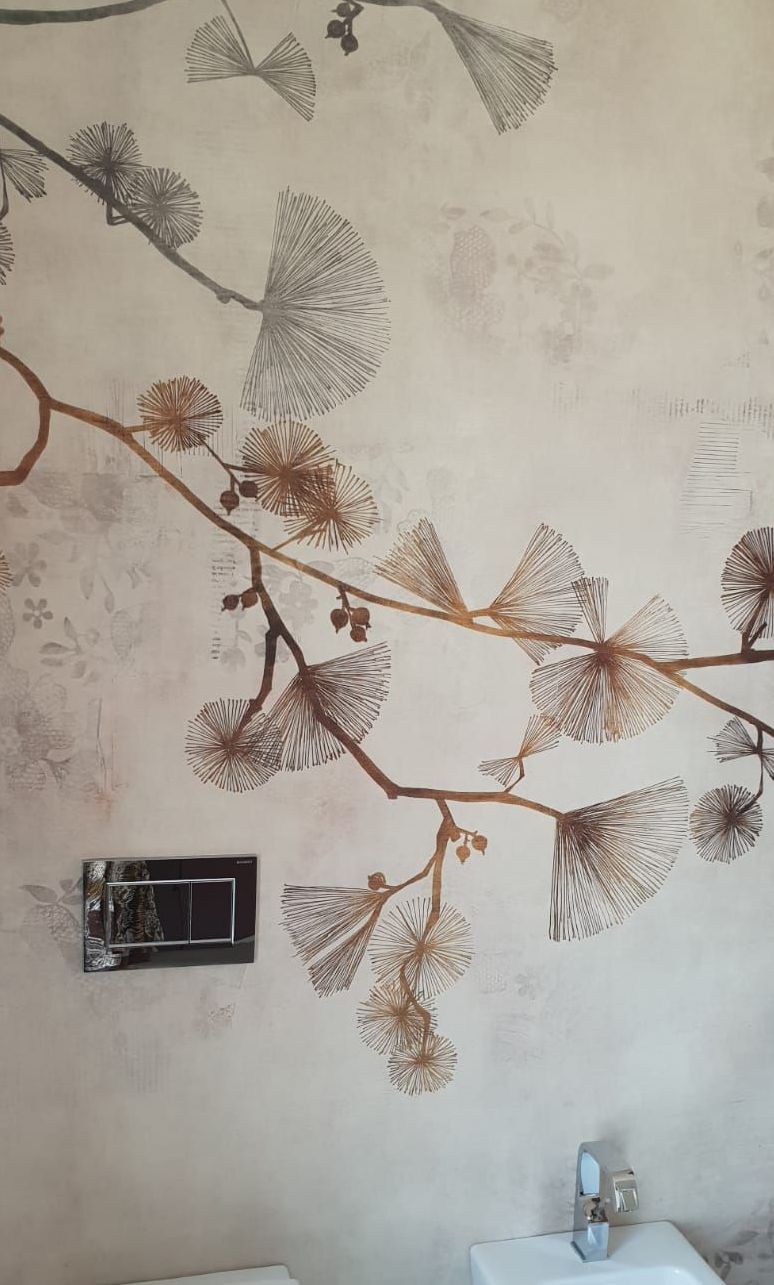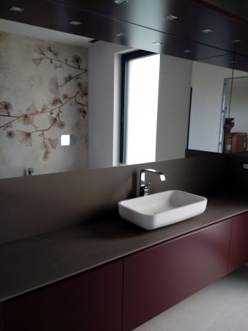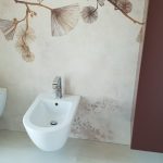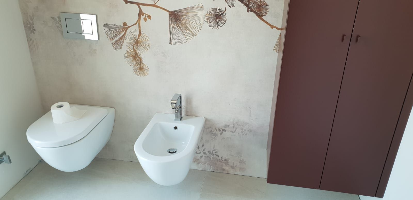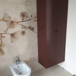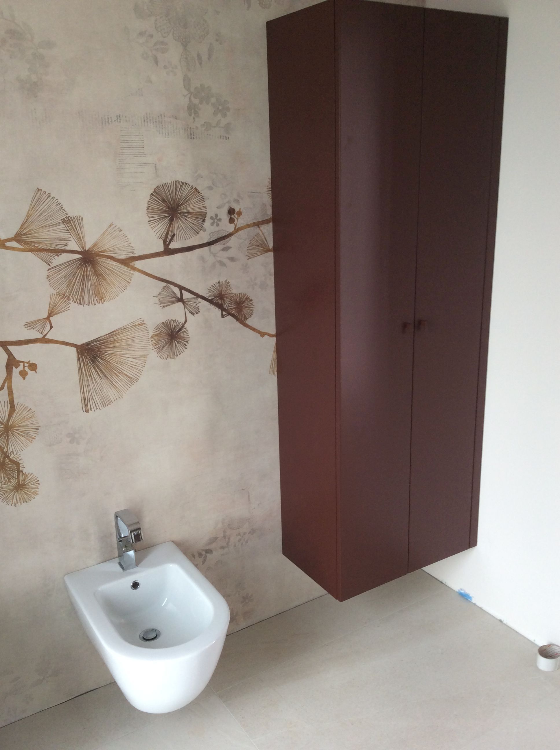 Sulla parete opposta, per l’esigenza del cliente, abbiamo inserito una colonna sospesa che riprende il colore del mobile con lavabo, un laccato opaco colore rubino scuro. La parete sulla quale abbiamo montato la colonna sospesa ed i sanitari è stata tappezzata con il rivestimento murale di Glamora in TNT. Abbiamo scelto Keiko, nella versione cromatica con colori caldi dagli ocra ai bruni su fondo sfumato nei toni del grigio chiaro. Sopra di esso abbiamo applicato della resina trasparente opaca che permetterà alla tappezzeria di poter essere lavata e di durare inalterata nel tempo all’interno di un bagno.
