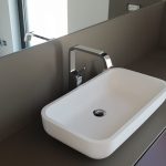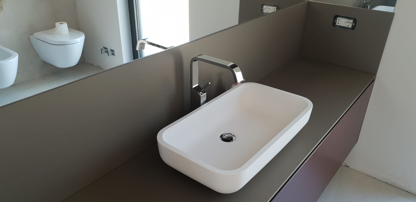 Anzichè piastrellare abbiamo realizzato degli schienali in resina, nello stesso materiale del top, foderando così le pareti dietro il lavabo. Sopra agli schienali abbiamo montato gli specchi collocandoli sia sulla parete lunga che sulle due laterali per dare una sensazione di maggiore ampiezza al bagno .