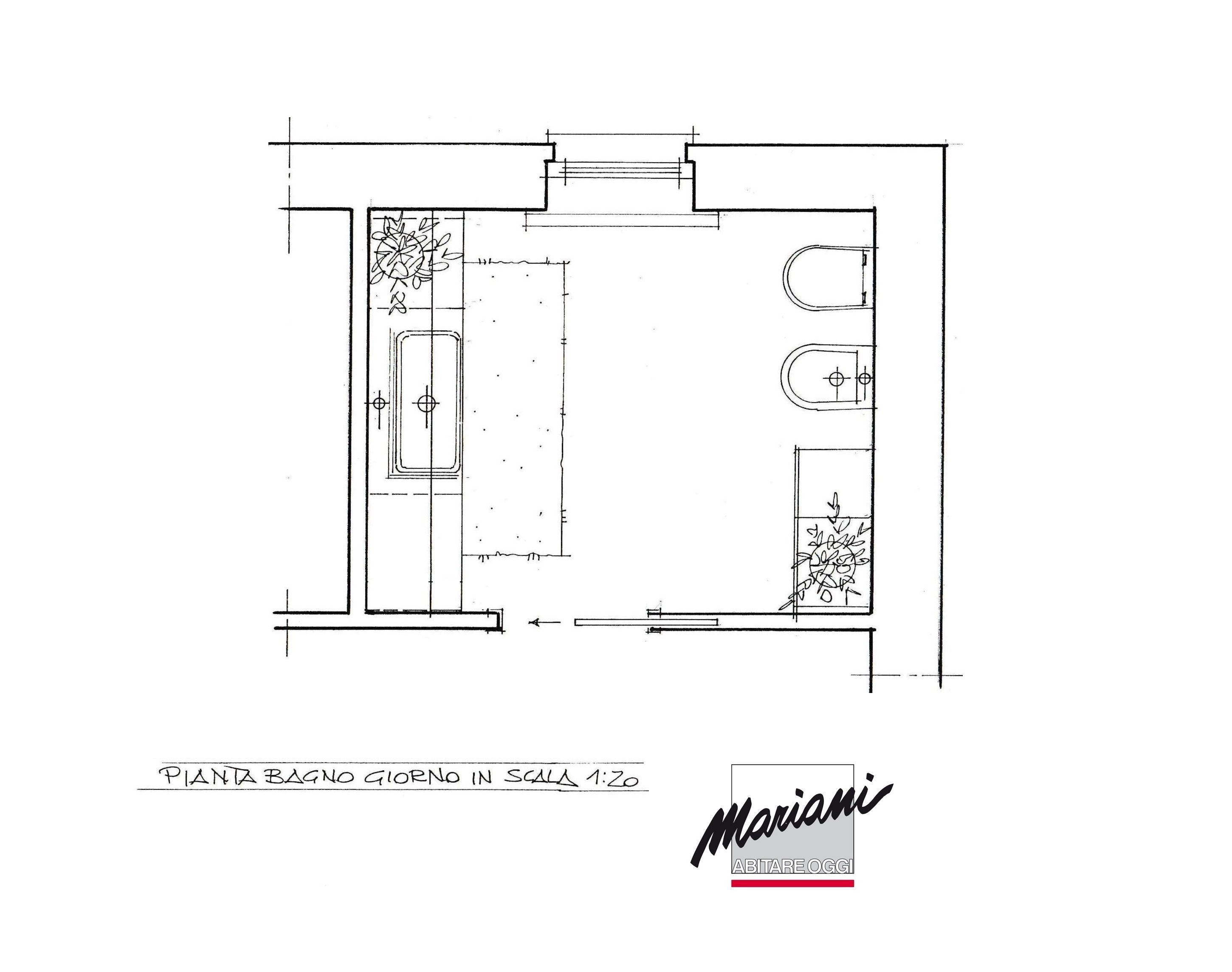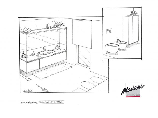 La progettazione di questo bagno aveva lo scopo di dare un’immagine d’eleganza, in armonia con gli altri ambienti della casa che abbiamo arredato. E’ un bagno che serve unicamente la zona giorno, è per questo motivo non è stata inserita la doccia.