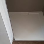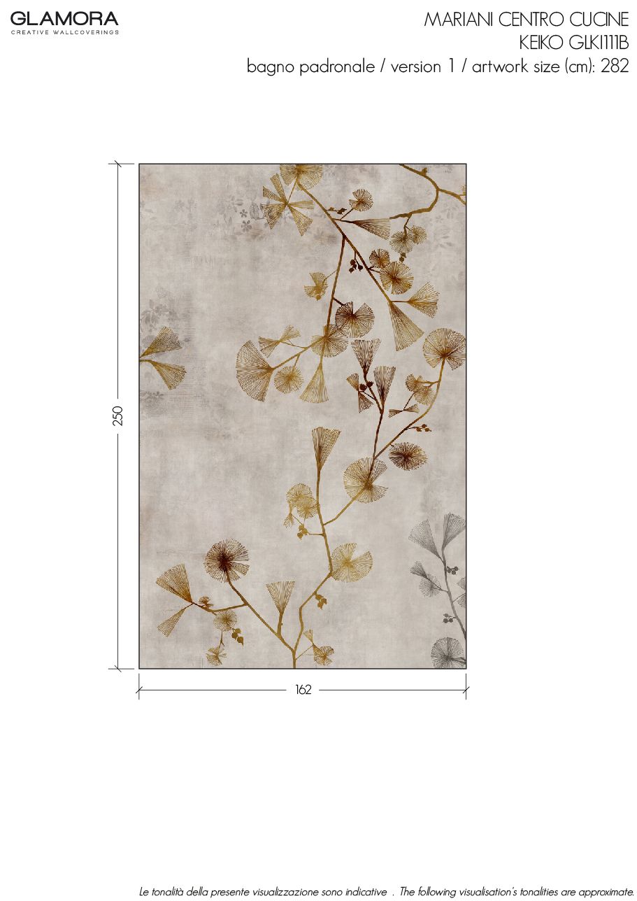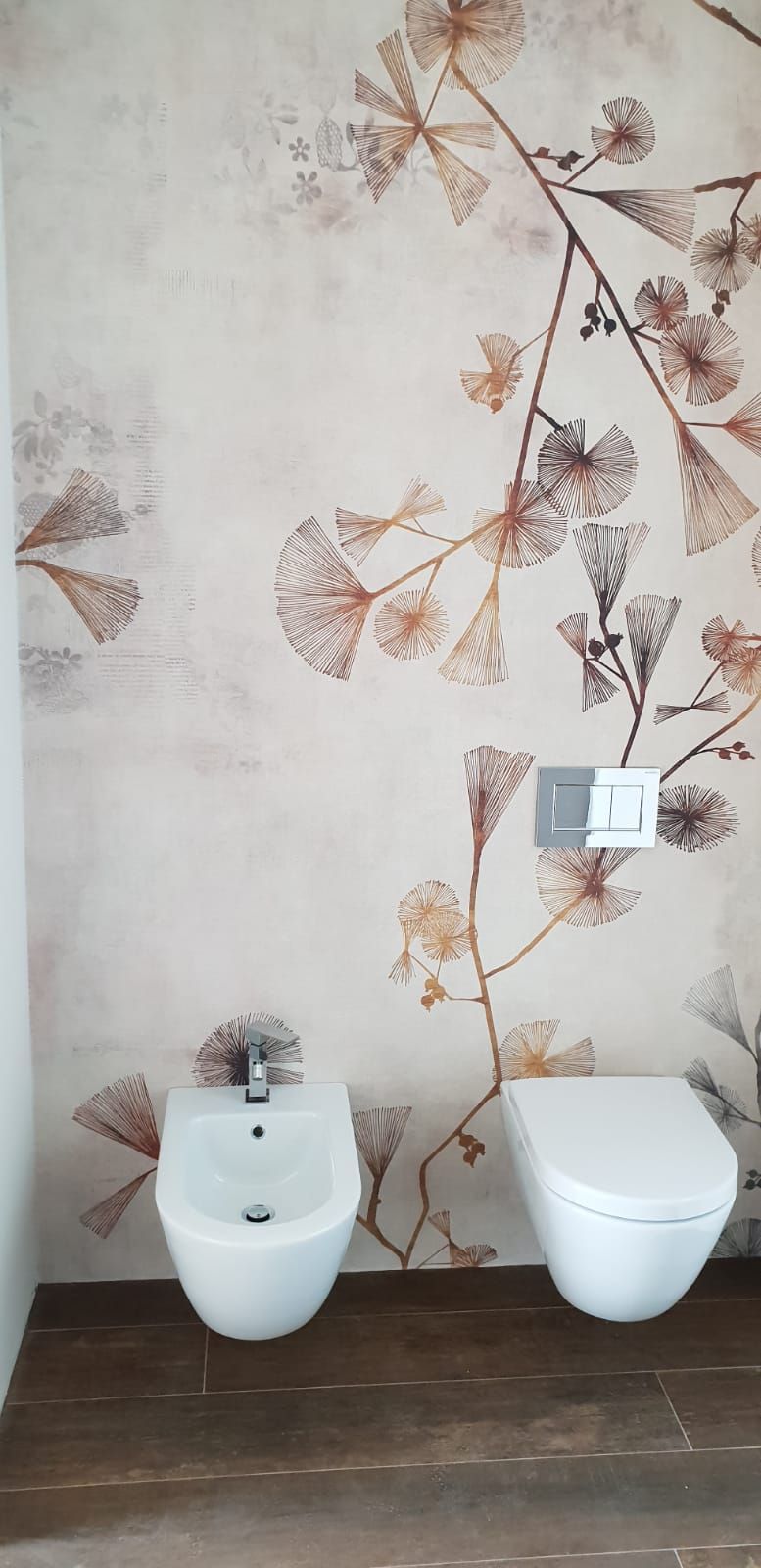 Insieme ai clienti abbiamo scelto il pavimento in kerlite con effetto legno, le piastrelle cm.100×50 color grigio e la carta da parati di Glamora mod. Keiko che abbiamo fatto resinare .