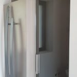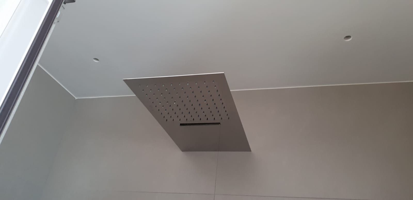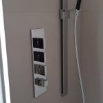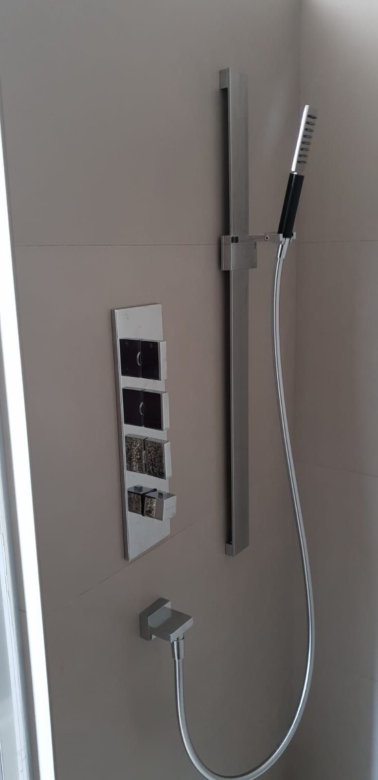 Per arredarla abbiamo inserito il piatto doccia a filo pavimento, il doccione Tremillimetri con caduta acqua a pioggia, nebulizzata e a cascata ed a completamento la doccia saliscendi Rettangolo il tutto di Gessi.