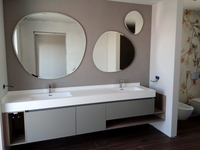 Per caratterizzare il mobile, la consolle non copre tutta la larghezza della nicchia, termina sulla destra prima dell’elemento a giorno a forma di “elle” del mobile Joy di Cerasa, ancora più particolari sono gli specchi retroilluminati di forma irregolare con bordo bisellato che creano…un effetto…wow!