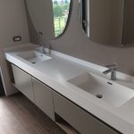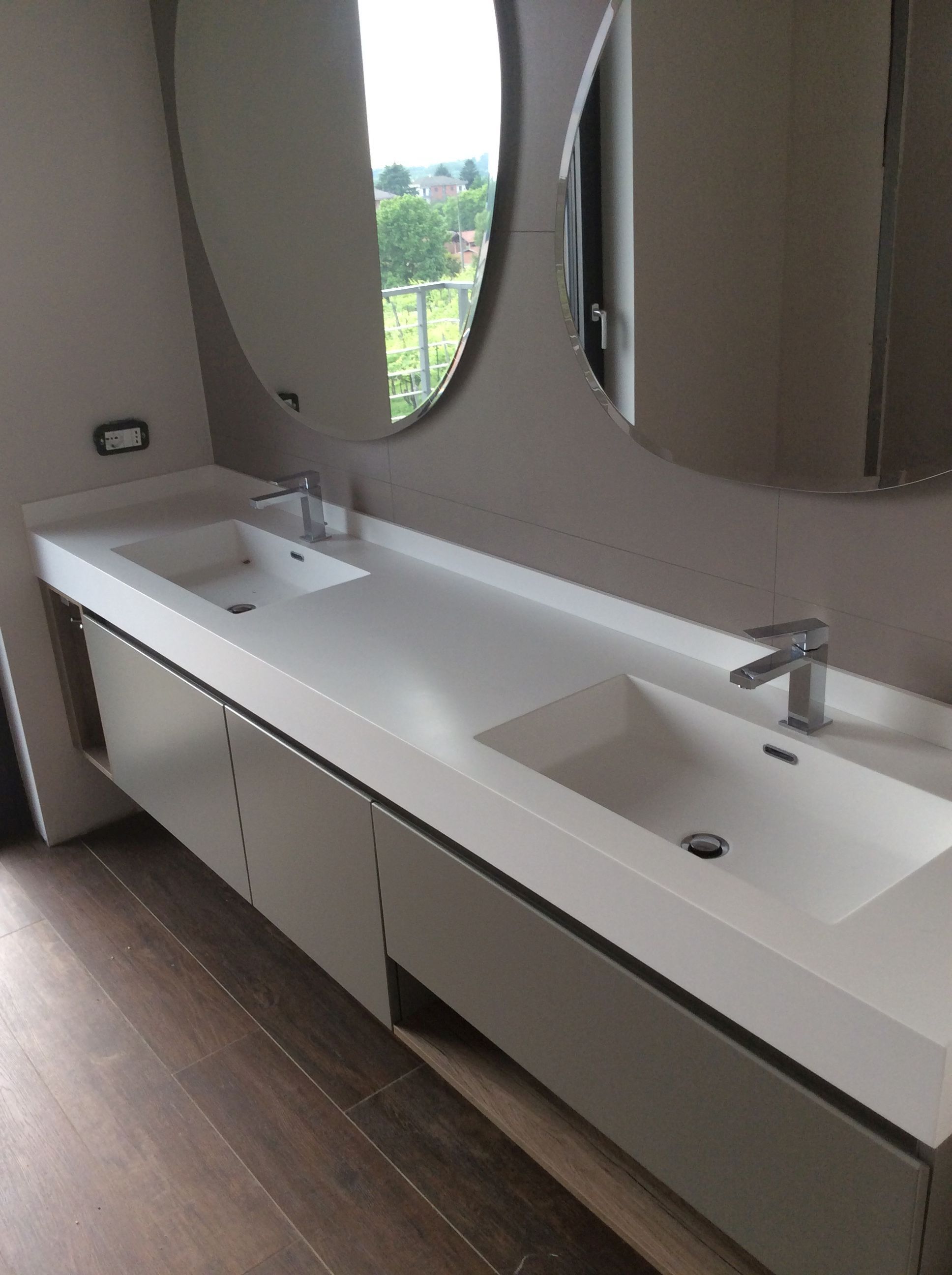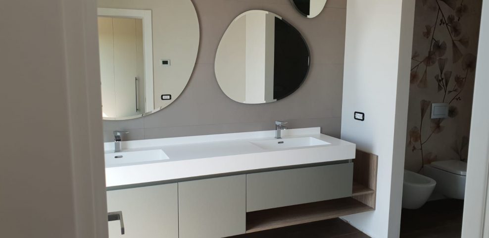 Appena entrati nella stanza vediamo il mobile realizzato con una consolle in tecnoril sp. cm.12 lunga cm.240 e profonda cm.51 con integrate due vasche di forma squadrata ed a sormontare i due lavabi abbiamo inserito i miscelatori Rettangolo di Gessi.