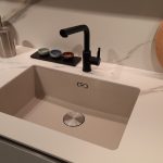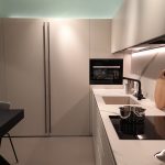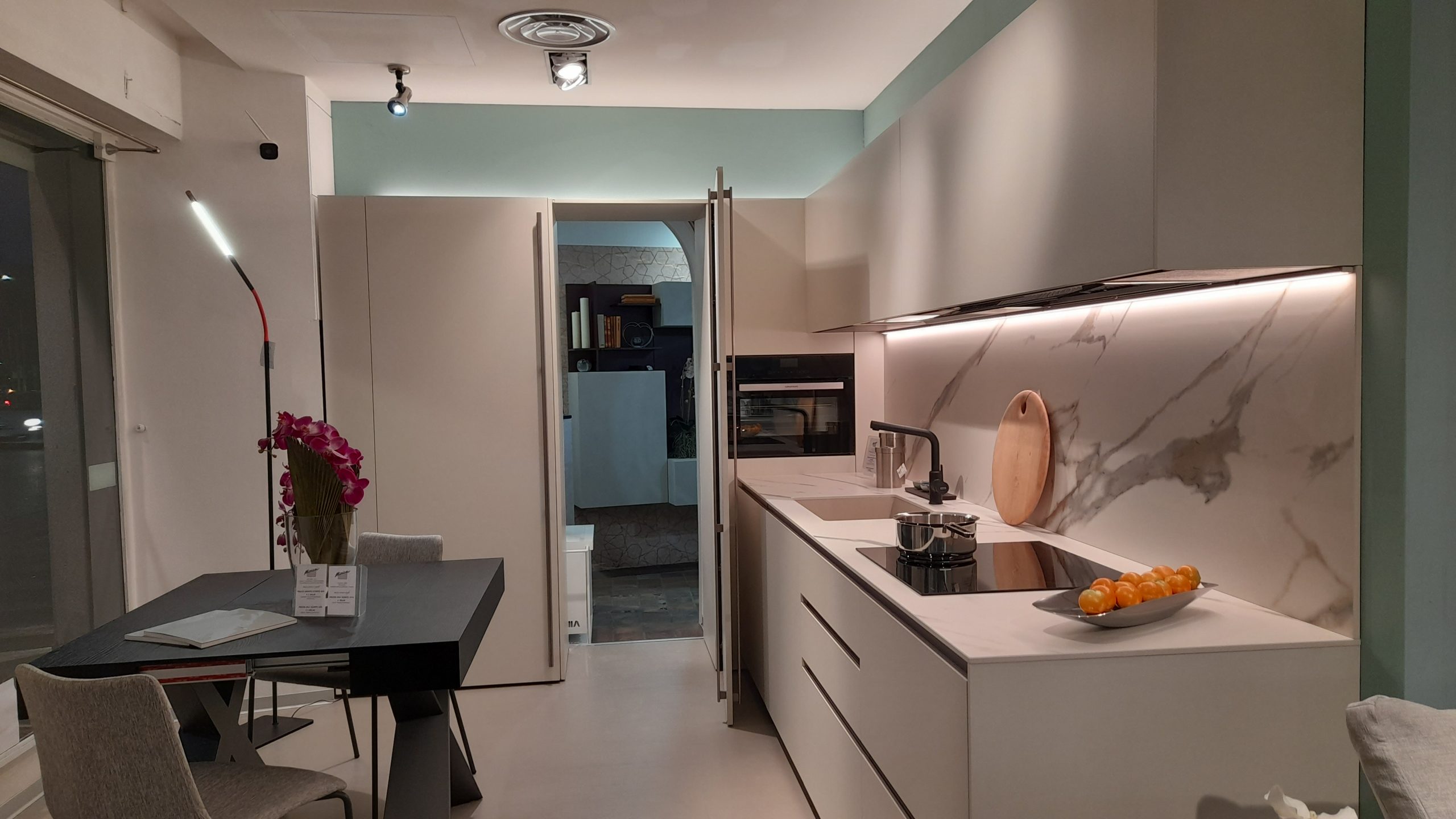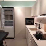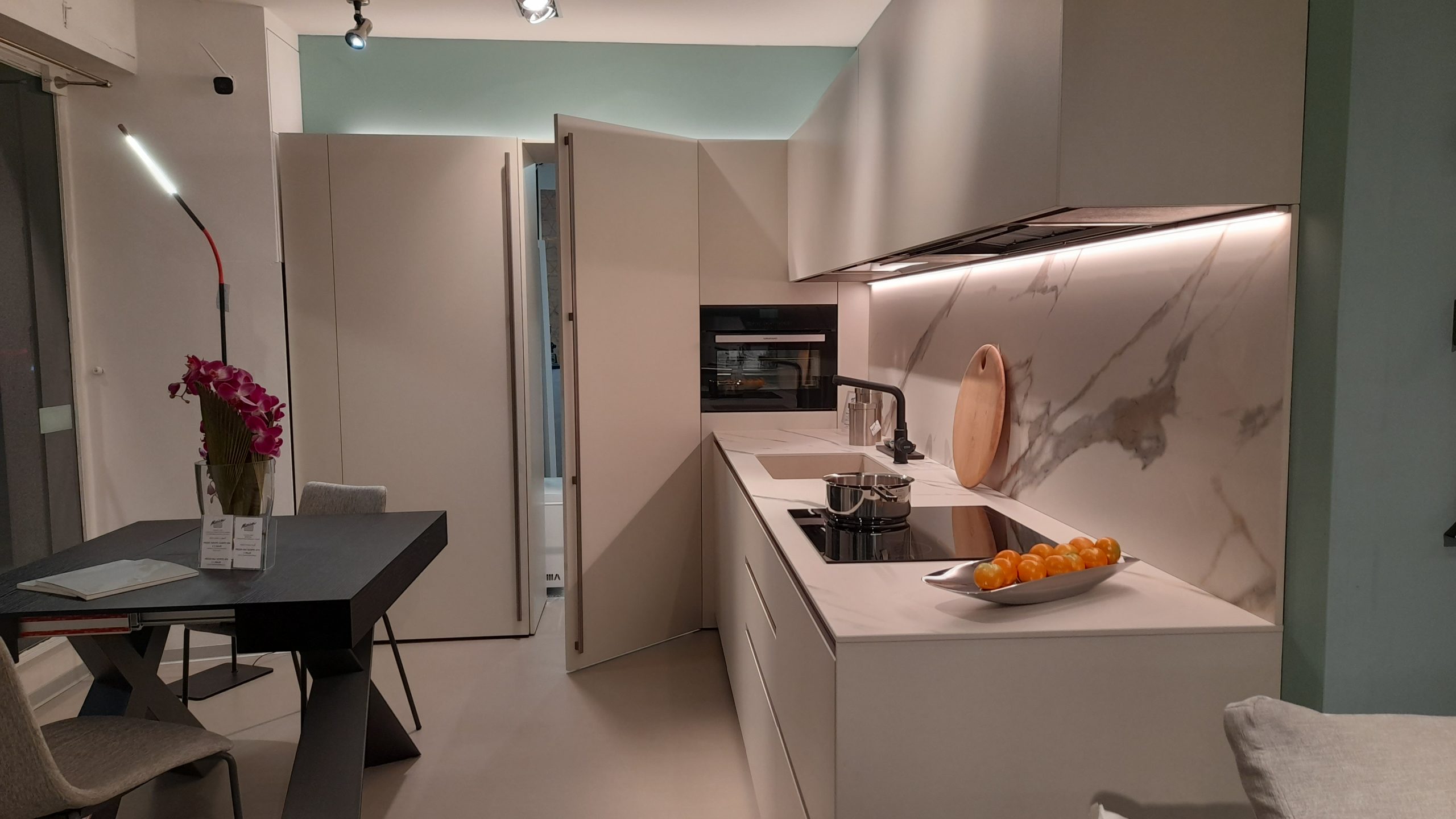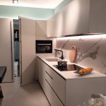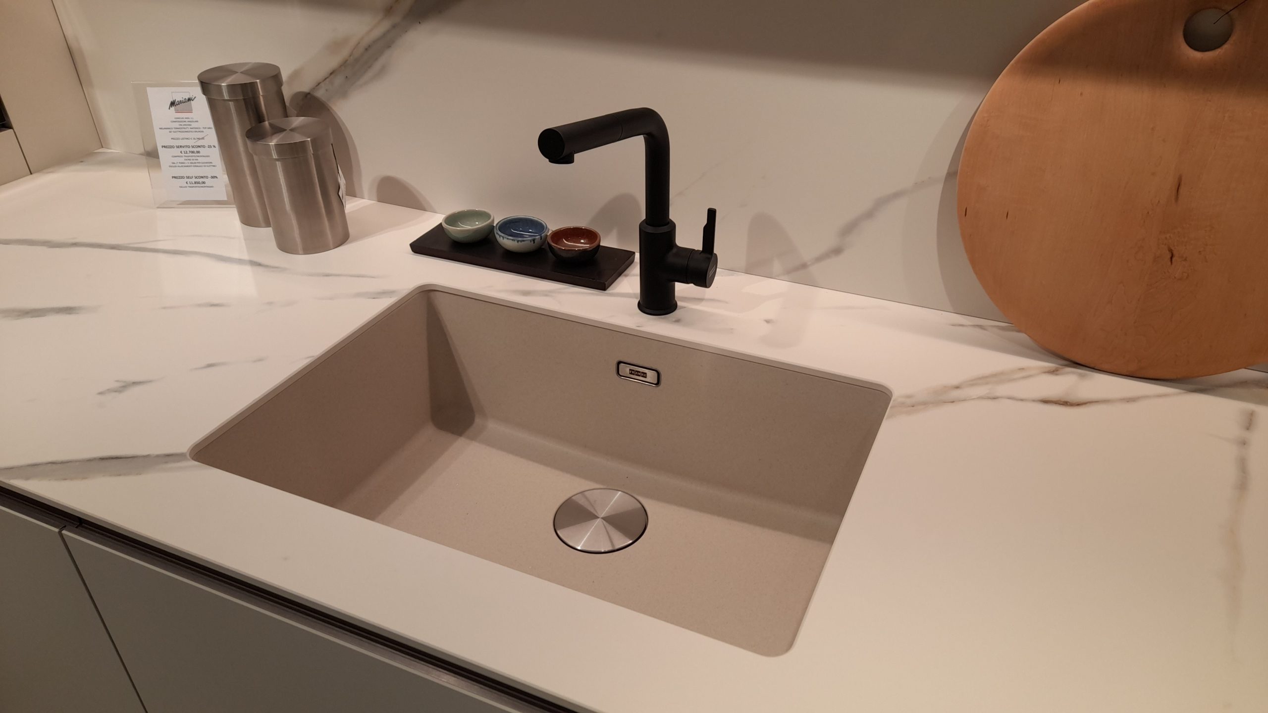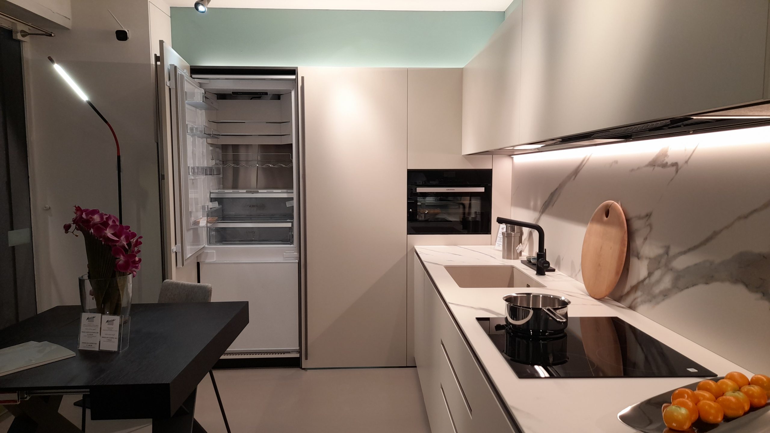 Frigocongelatore da 405 litri, forno compatto, lavello 1 vasca sottotop colore tortora, miscelatore con doccetta estraibile nero, piano cottura ad induzione 4 fuochi, cappa cm. 90 e lavastoviglie a scomparsa.