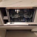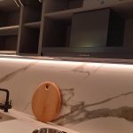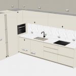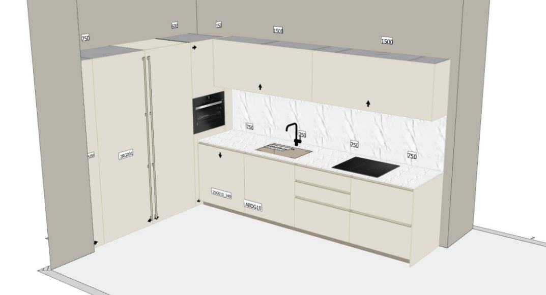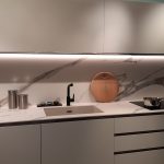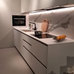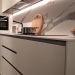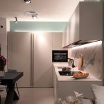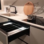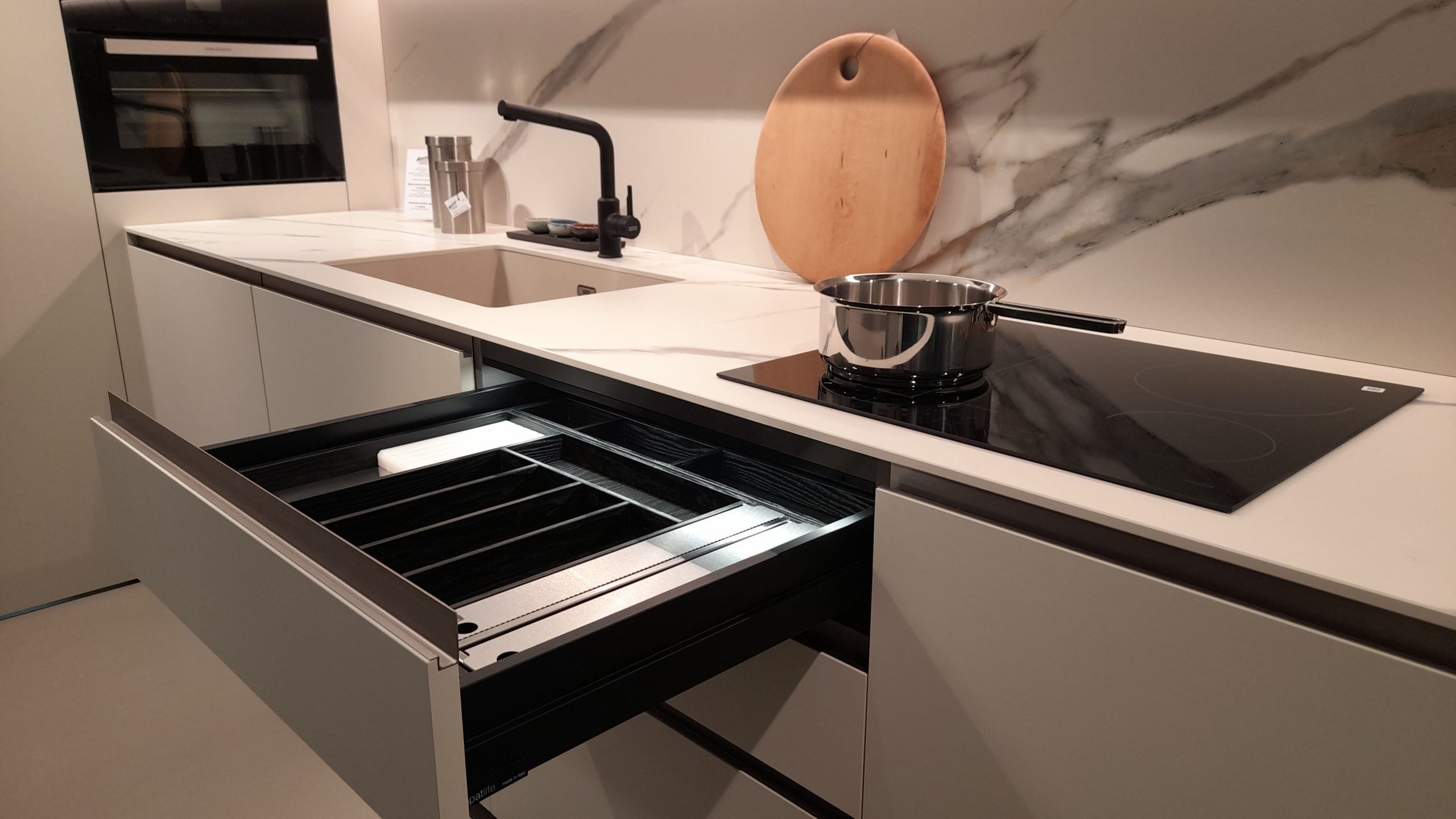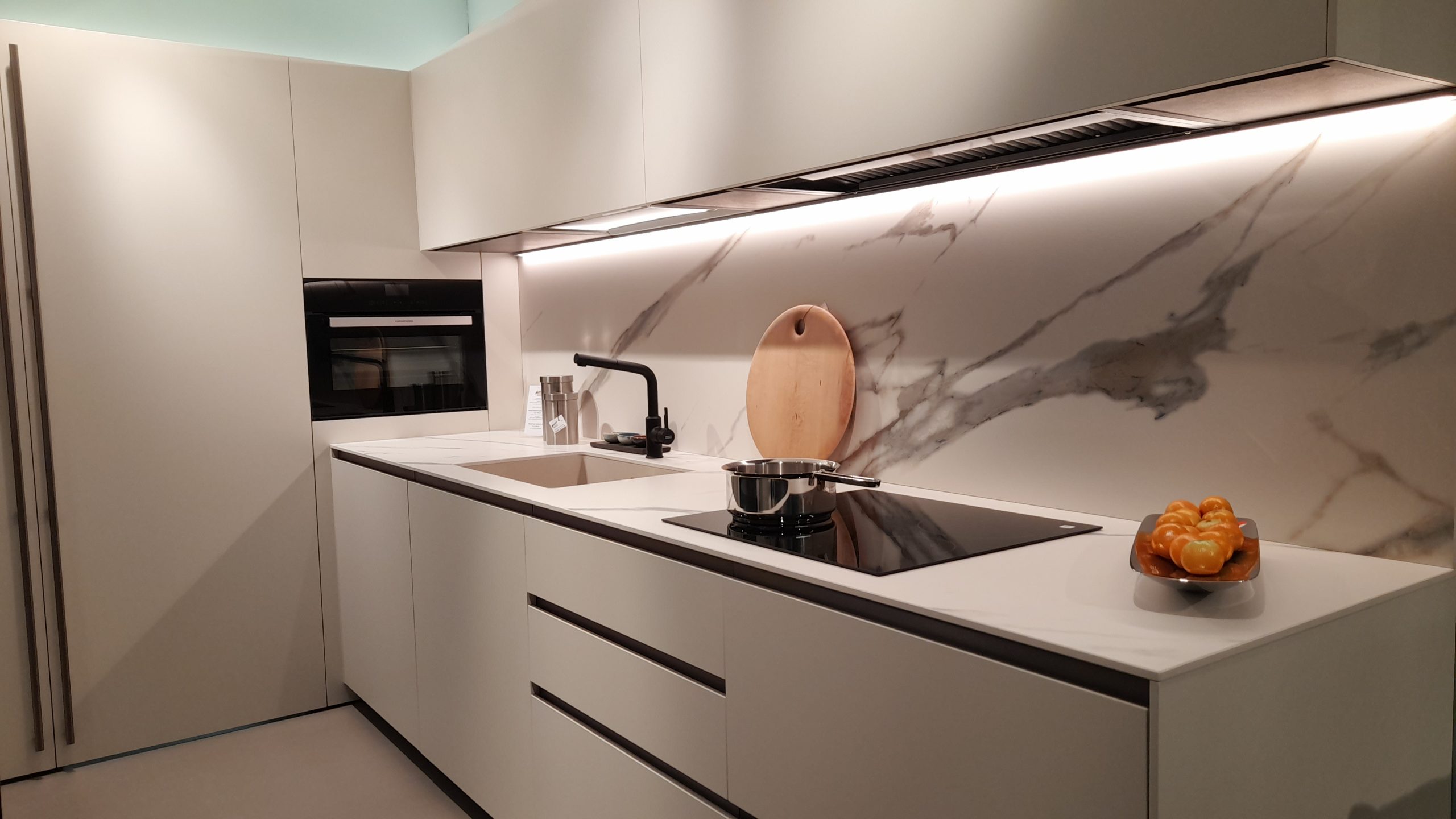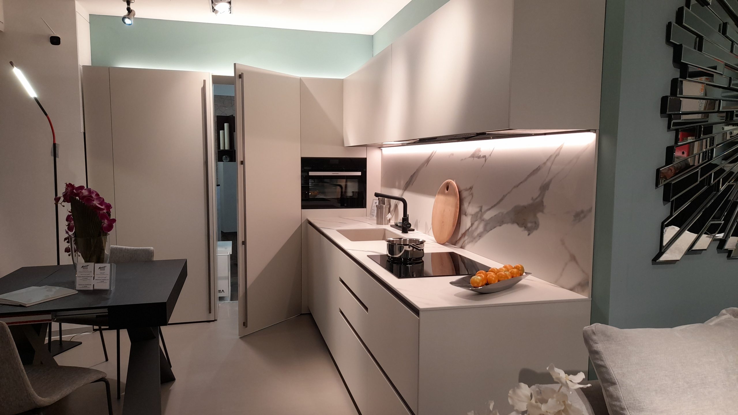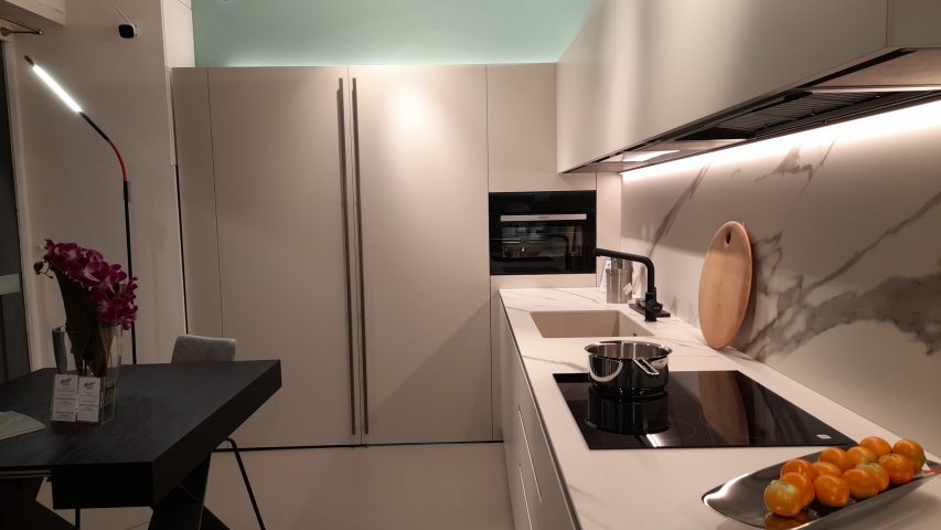 Frigocongelatore da 405 litri, forno compatto, lavello 1 vasca sottotop colore tortora, miscelatore con doccetta estraibile nero, piano cottura ad induzione 4 fuochi, cappa cm. 90 e lavastoviglie a scomparsa.