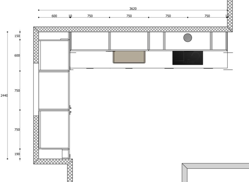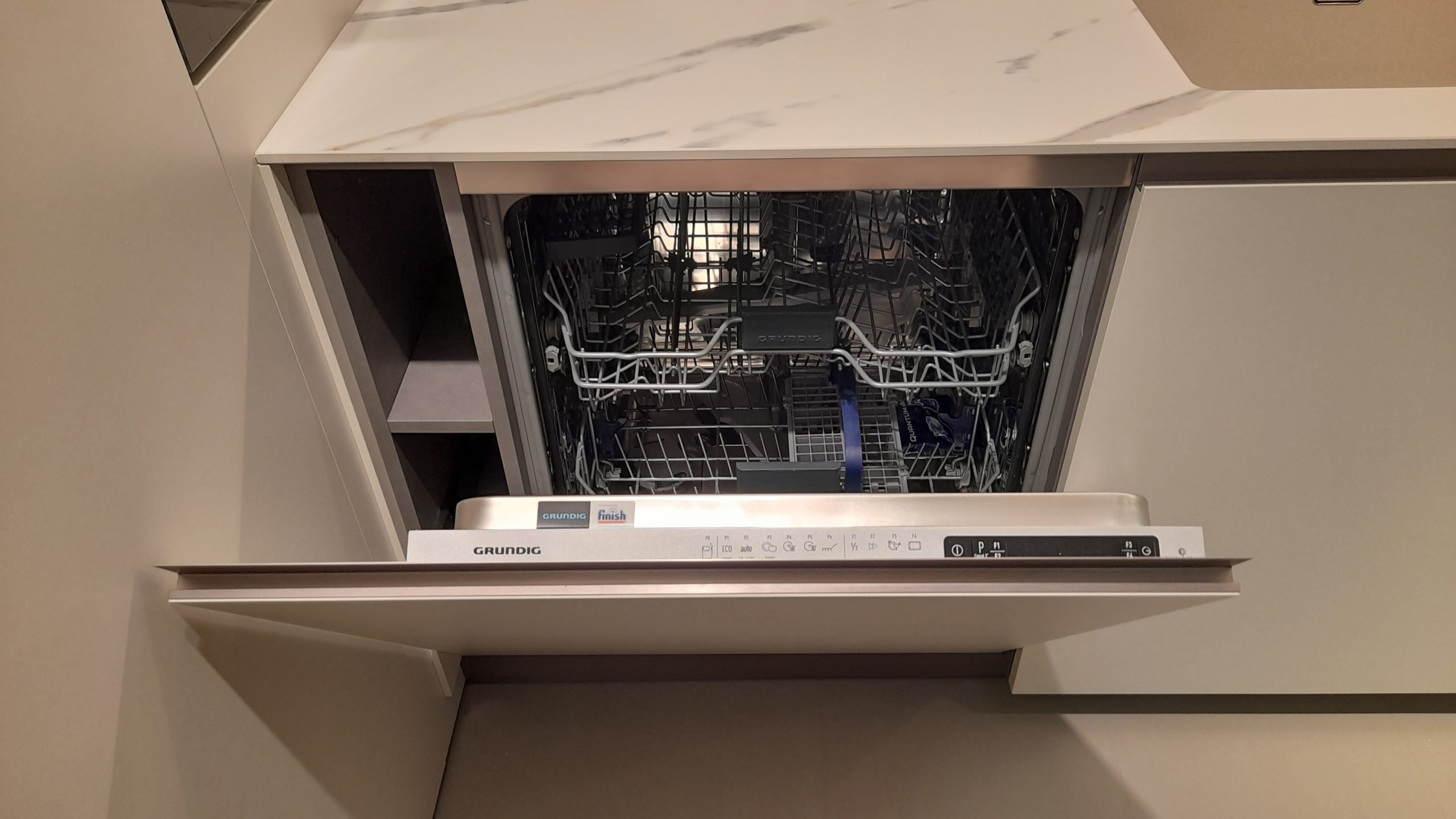 composto da lavastoviglie a scomparsa con anta larga cm. 75 e vano interno di cm. 15, base sottolavello con anta estraibile di cm. 75 e kit per indifferenziato, base con 2 cassetti e cestone, con portaposate completo di porta pellicole e porta coltelli, base con due cestoni, entrambe larghe cm. 75.