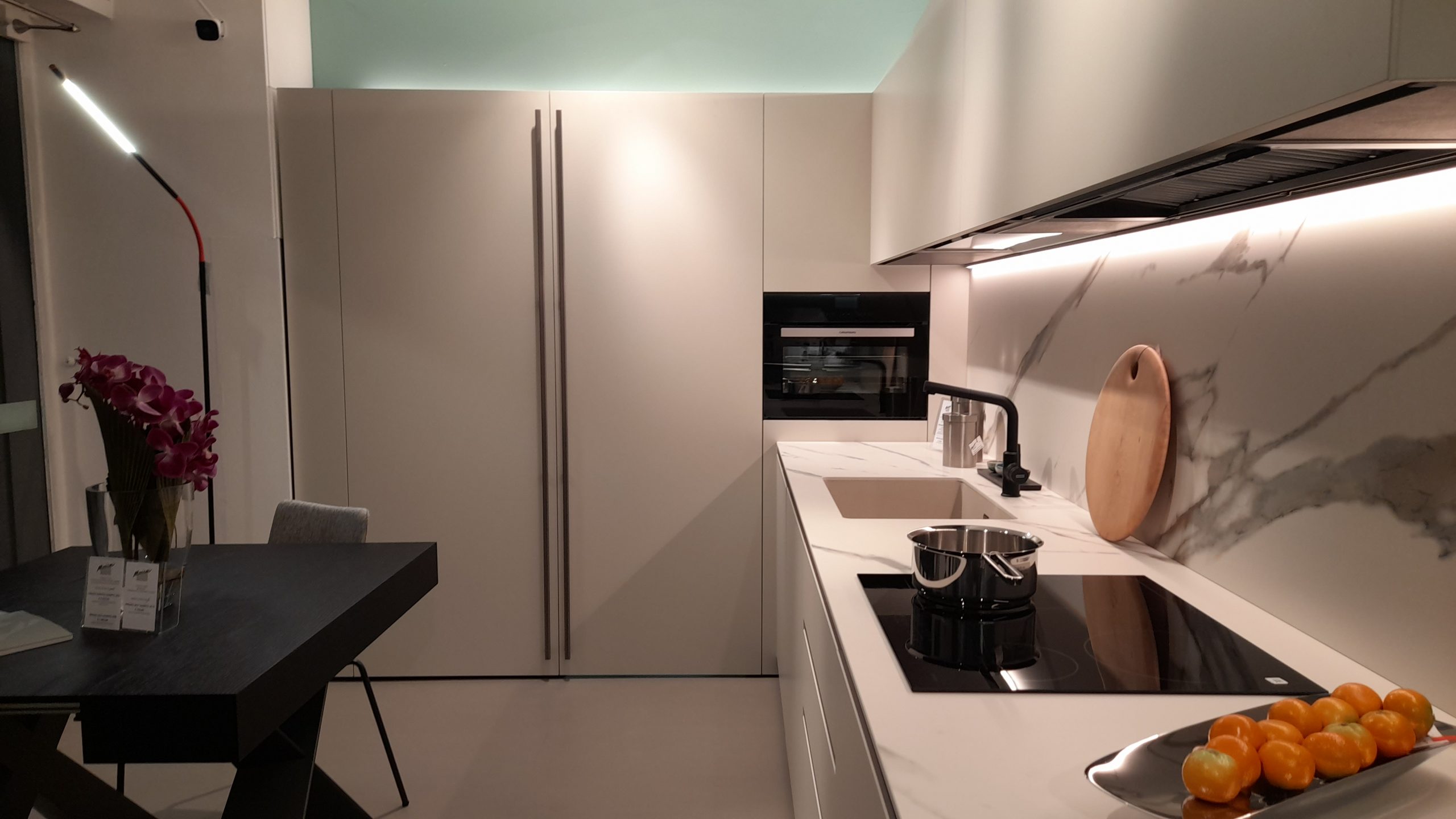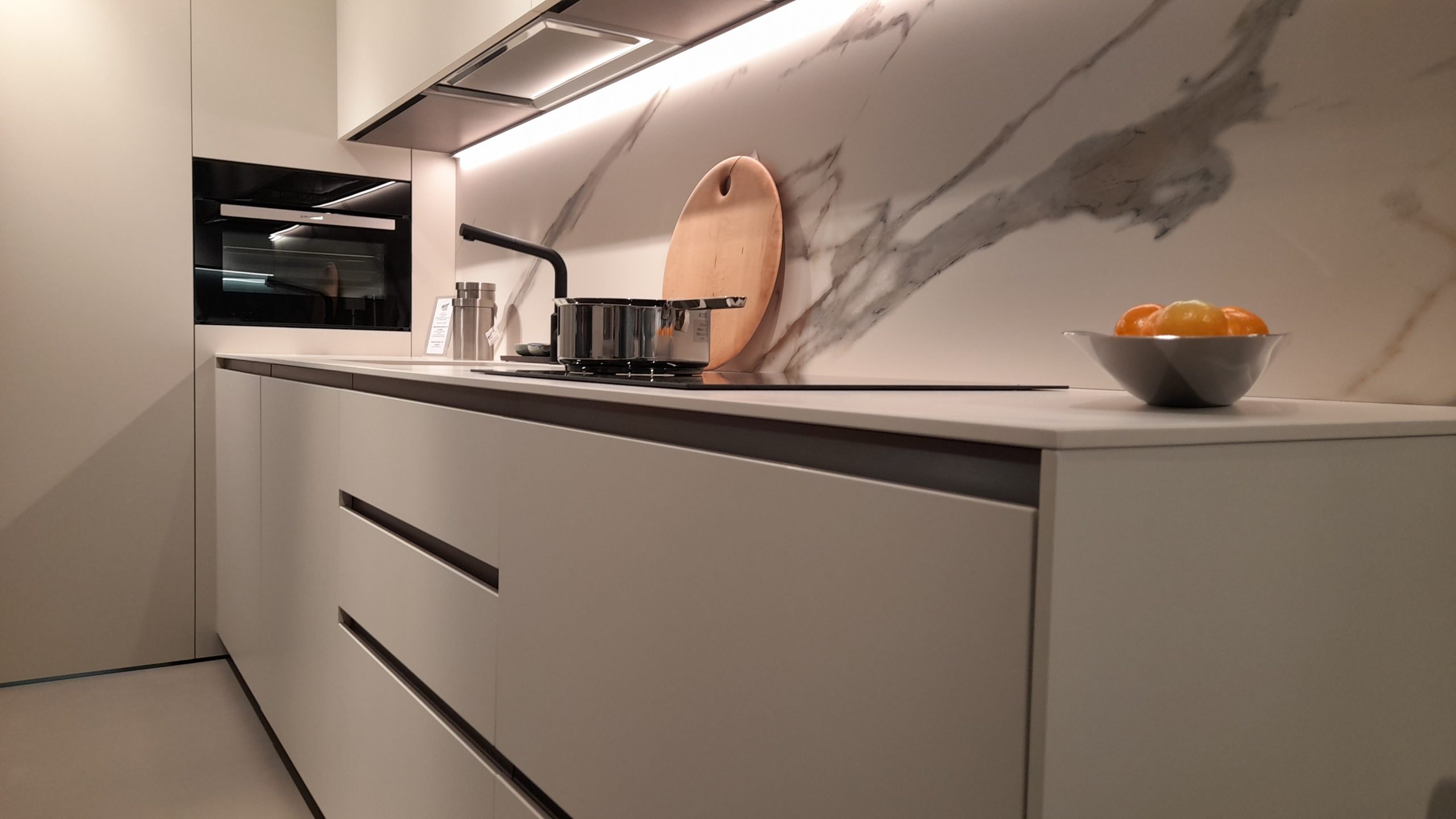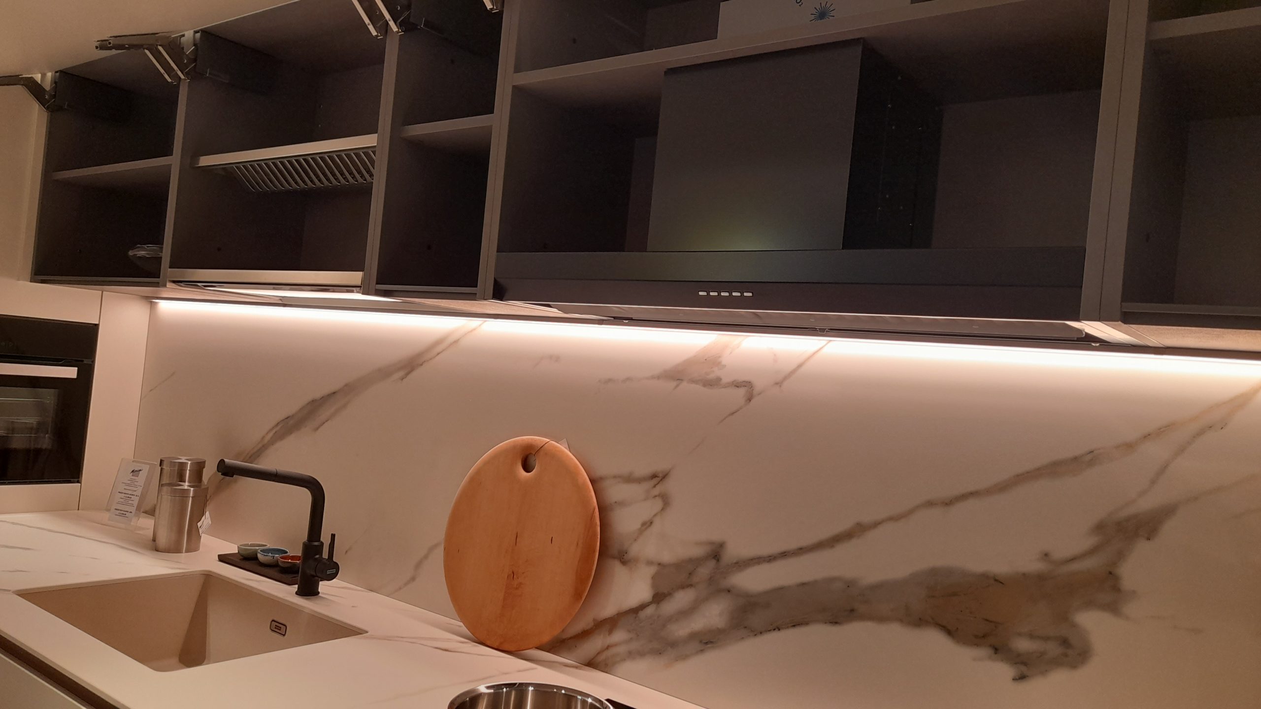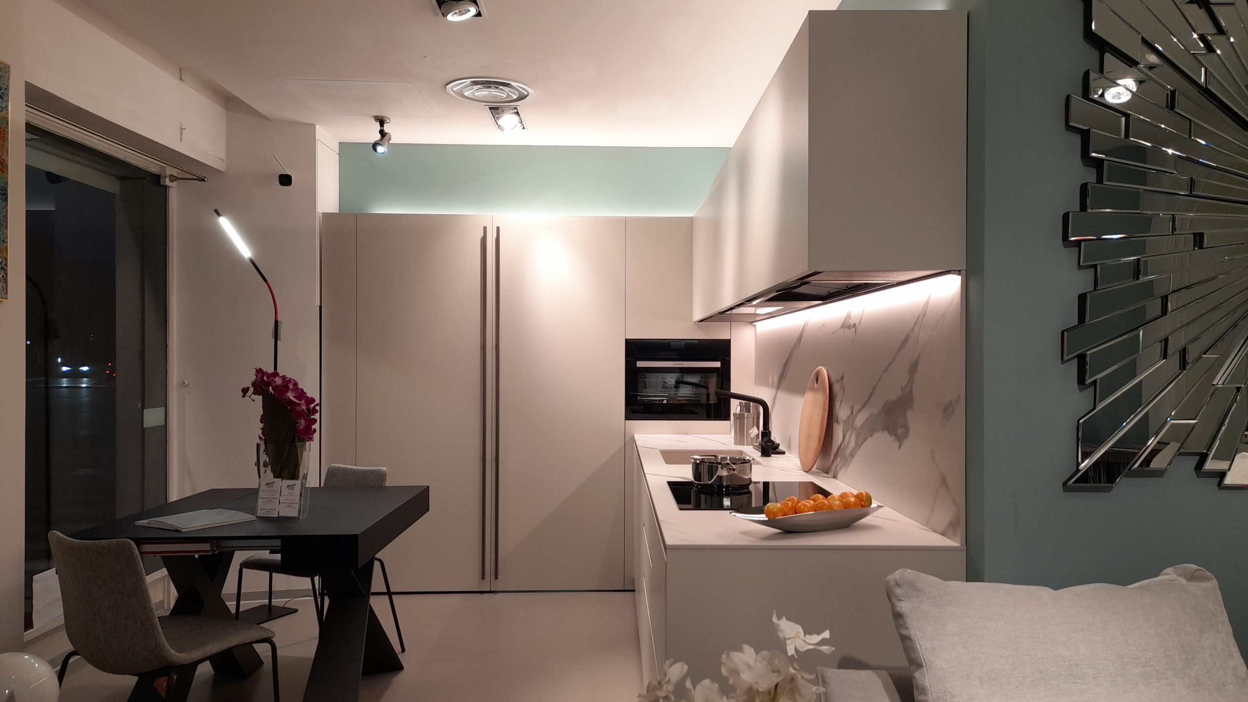 La cucina realizzata in melaminico cotone è completa di barra led dimmerabile, di luci interne nelle basi e dei seguenti elettrodomestici: