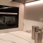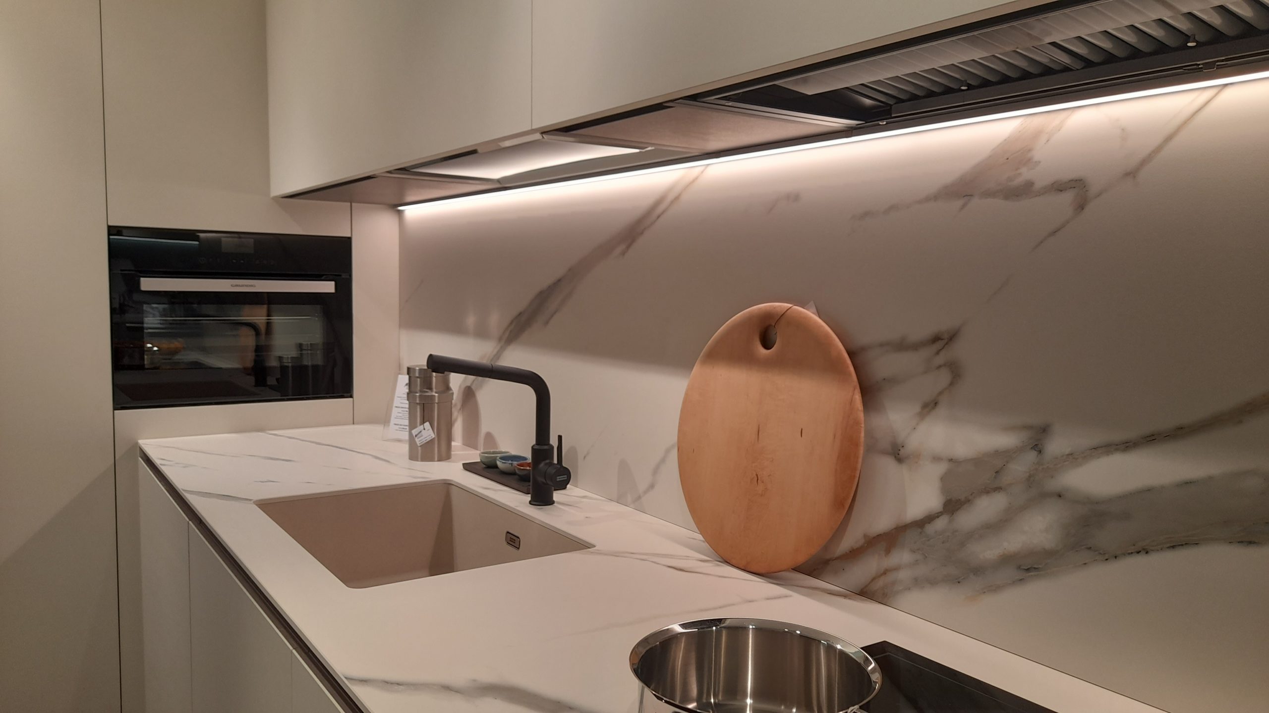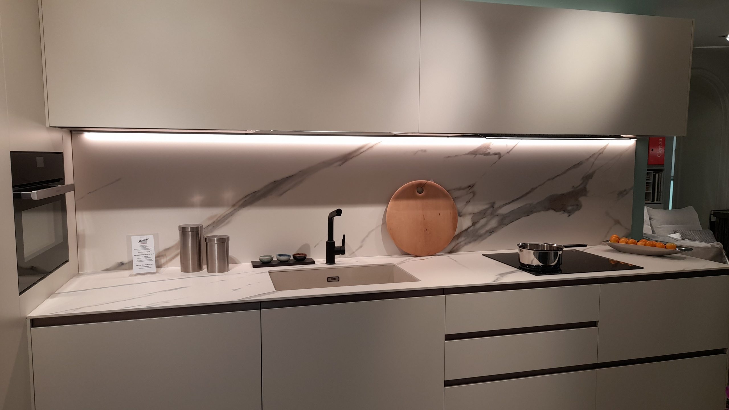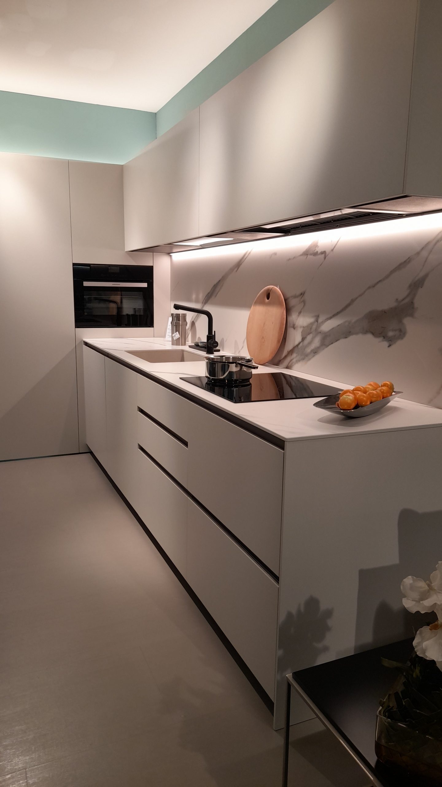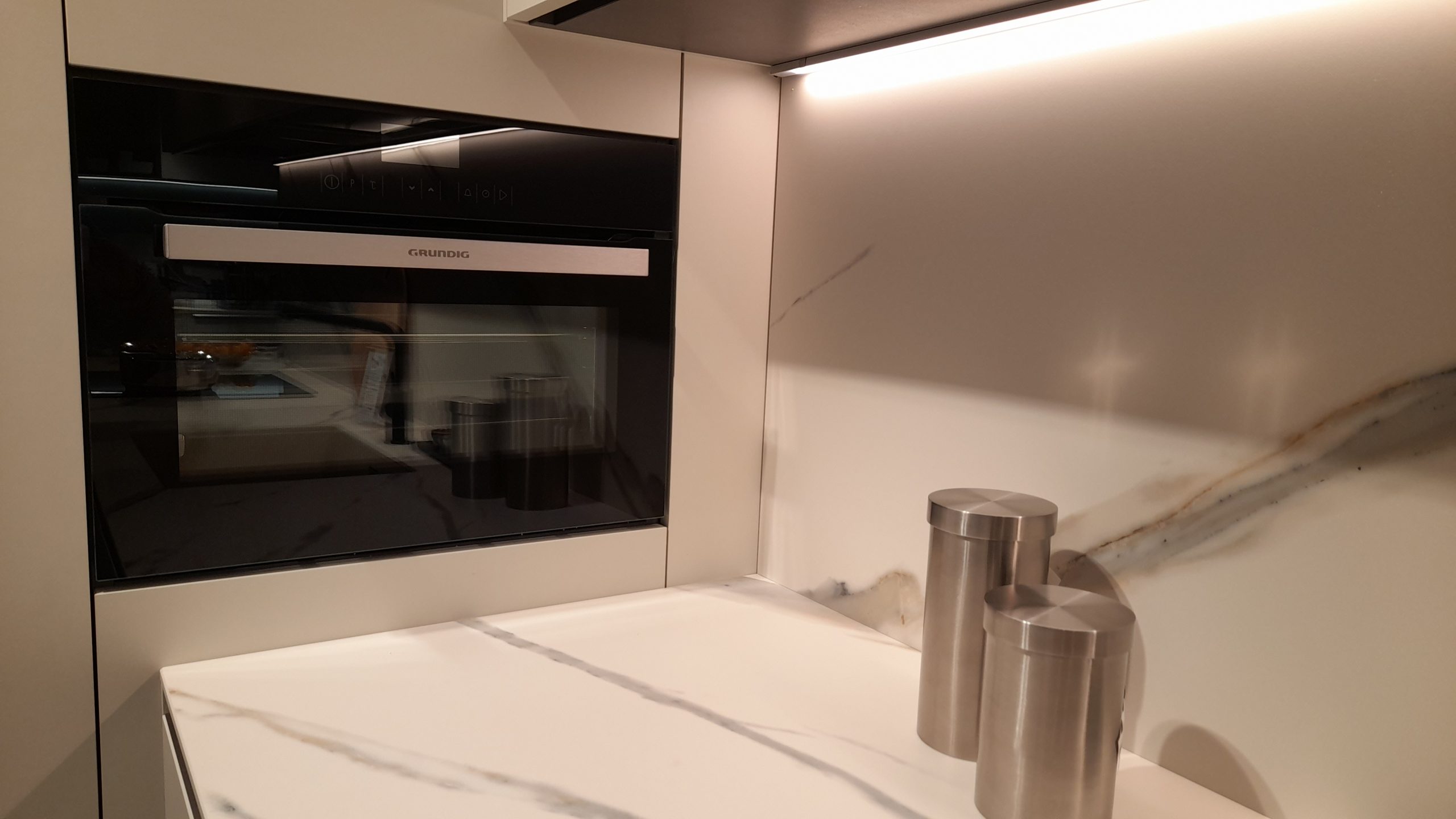 La cucina realizzata in melaminico cotone è completa di barra led dimmerabile, di luci interne nelle basi e dei seguenti elettrodomestici: