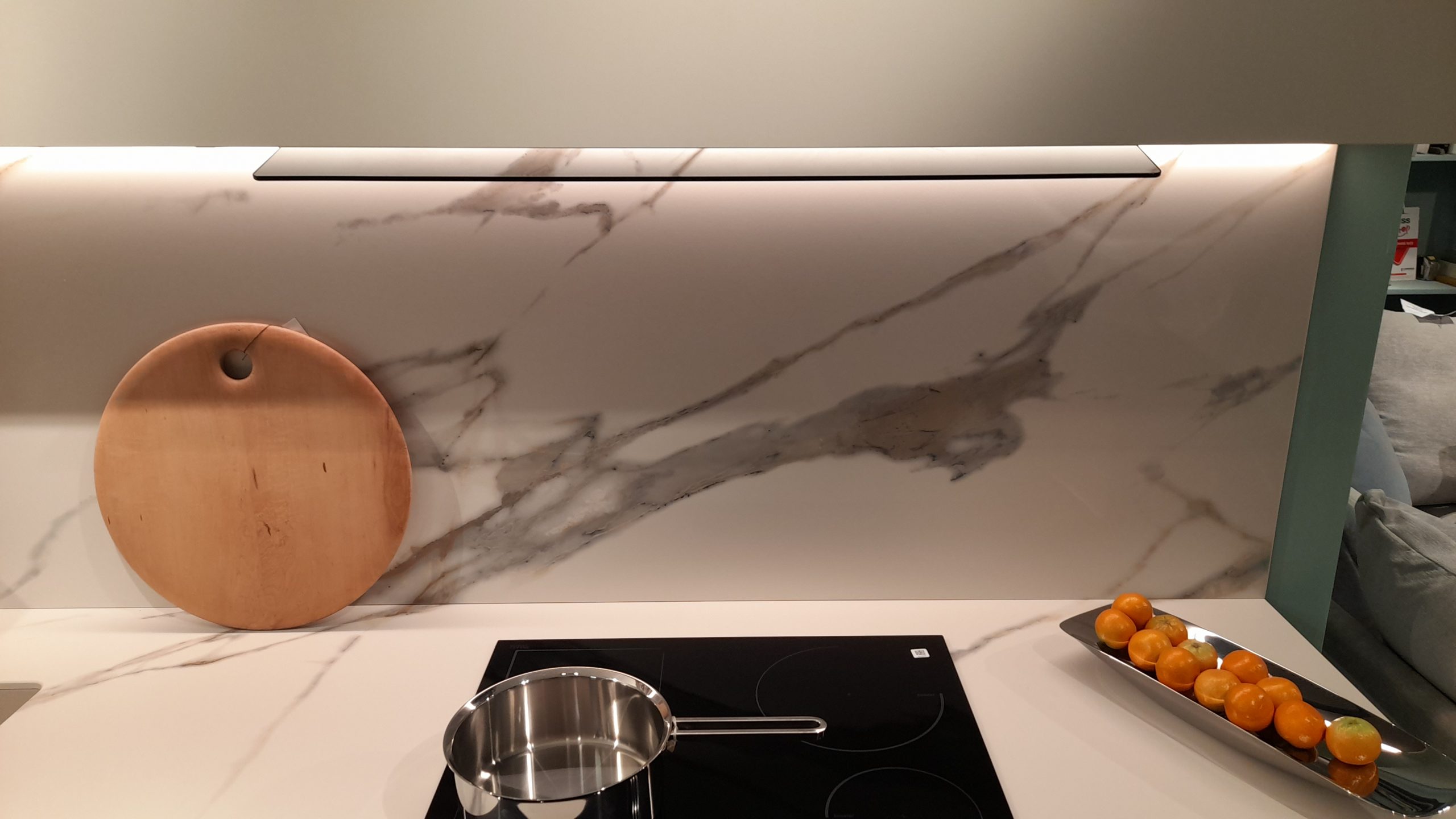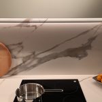 Il top è in Abitum Calacatta satinato sp. cm. 1, dello stesso materiale lo schienale alto cm. 60.