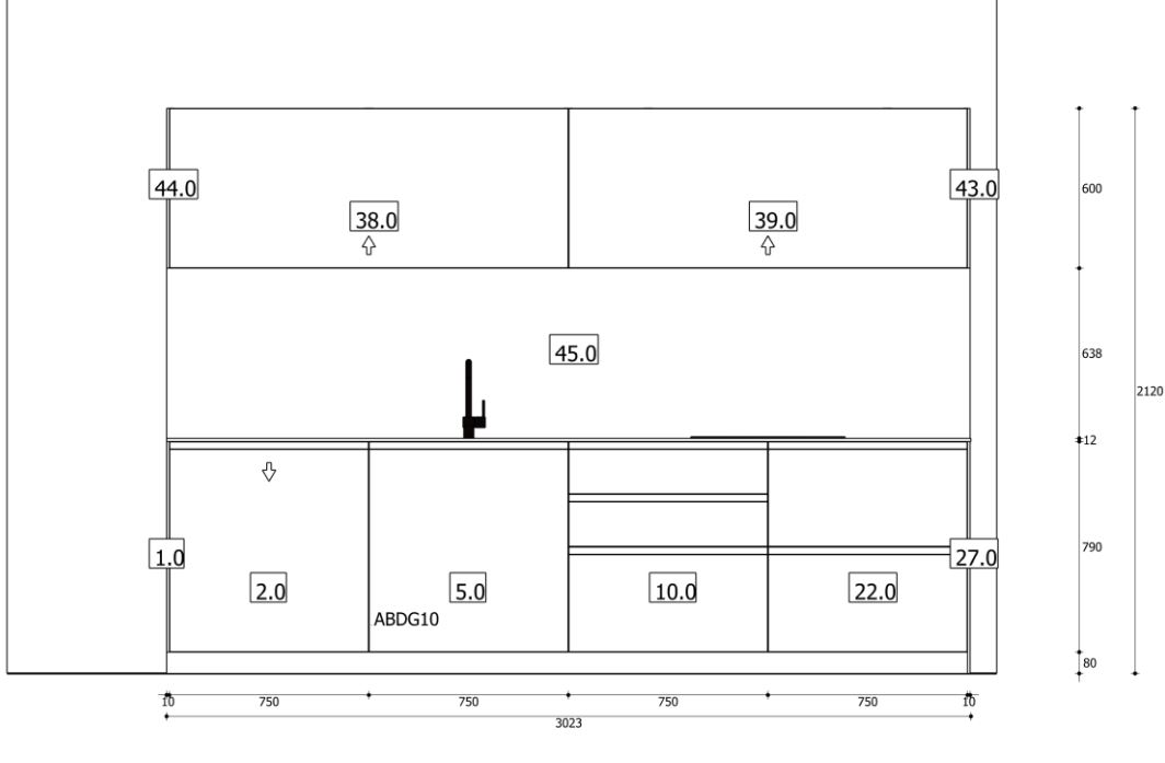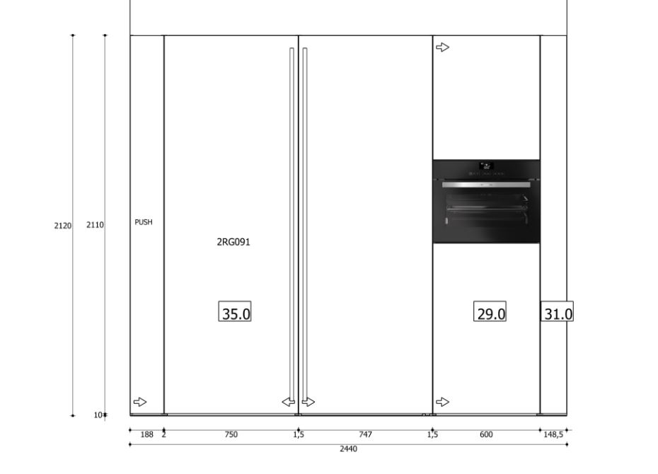 gruppo colonne cm. 244 x 59 x 212 h. con zoccolo a scomparsa, primo elemento fascia apribile, segue colonna per frigocongelatore larga cm. 75, passaggio con porta, colonna con forno compatto integrato.