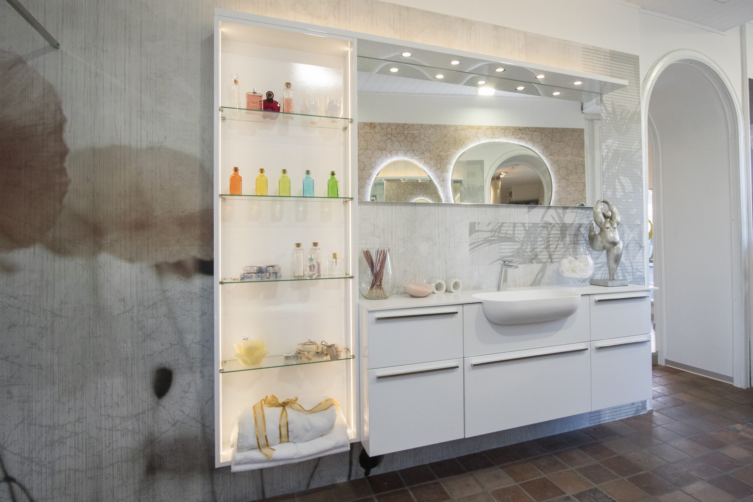 Composizione mod. Giunone in laccato bianco lucido: colonna cm.60 con led integrato sui fianchi e ripiani cristallo, basi con cestoni profonde cm. 36