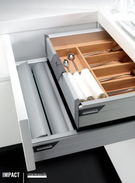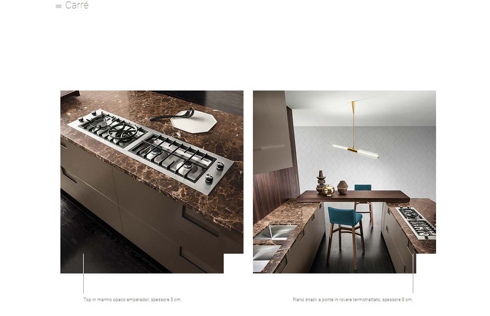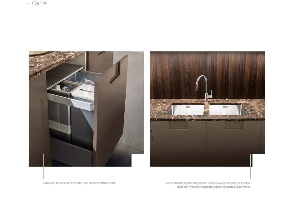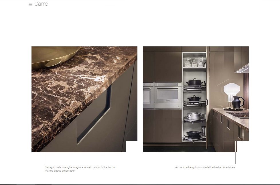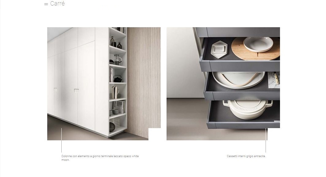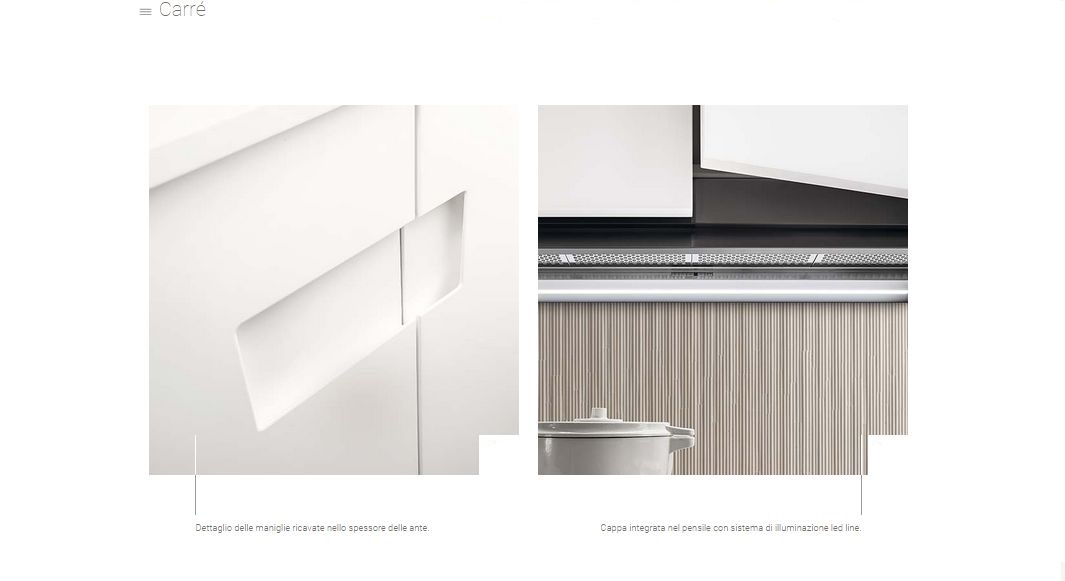 Caratteristica di Carrè è la maniglia, che si trasforma in un elegante incavo nell’anta ed è realizzabile in ben 230.000 tra forme, dimensioni e colori.