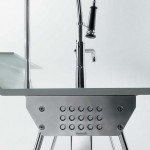 Un’isola leggera in grado di accogliere attorno a sè più funzioni contemporaneamente. Ecco Solaris, l’isola free standing in CORIAN®, dalla forma moderna e affusolata. La carenatura sottopiano è interamente in acciaio inox. L’irradiazione luminosa diffusamente morbida è ottenuta mediante una lampada, finitura CORIAN®, dotata di schermo in vetro opalino e montata su un’asta tubolare in acciaio. Sulle facciate sono alloggiati l’interruttore per la lampada e le prese di corrente per i piccoli elettrodomestici. I tubi del gas. del carico e scarico dell’acqua ed i cavi per l’alimentazione elettrica sono invece alloggiati in una struttura modulare e flessibile in acciaio inox.
