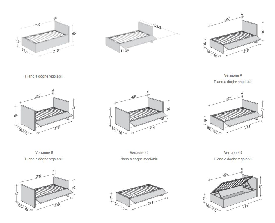 Primo letto con materasso cm. 90 x 200 oppure cm. 100 x 200; secondo letto con materasso cm. 85 x 200