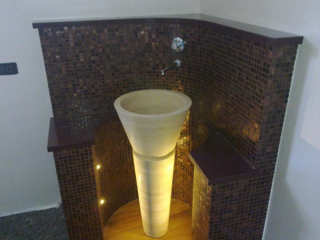 La salle de bain est conçu dans le but de surprendre les invités de la résidence, dès que vous ouvrez la porte de la chambre, la première chose que vous voyez est l’évier sculpté dans le travertin nous avons réalisé un armature de forme circulaire afin de l’accueillir et de le valoriser qui elle-même a été recouvert de mosaïque de verre irisé d’une couleur rouge vin.