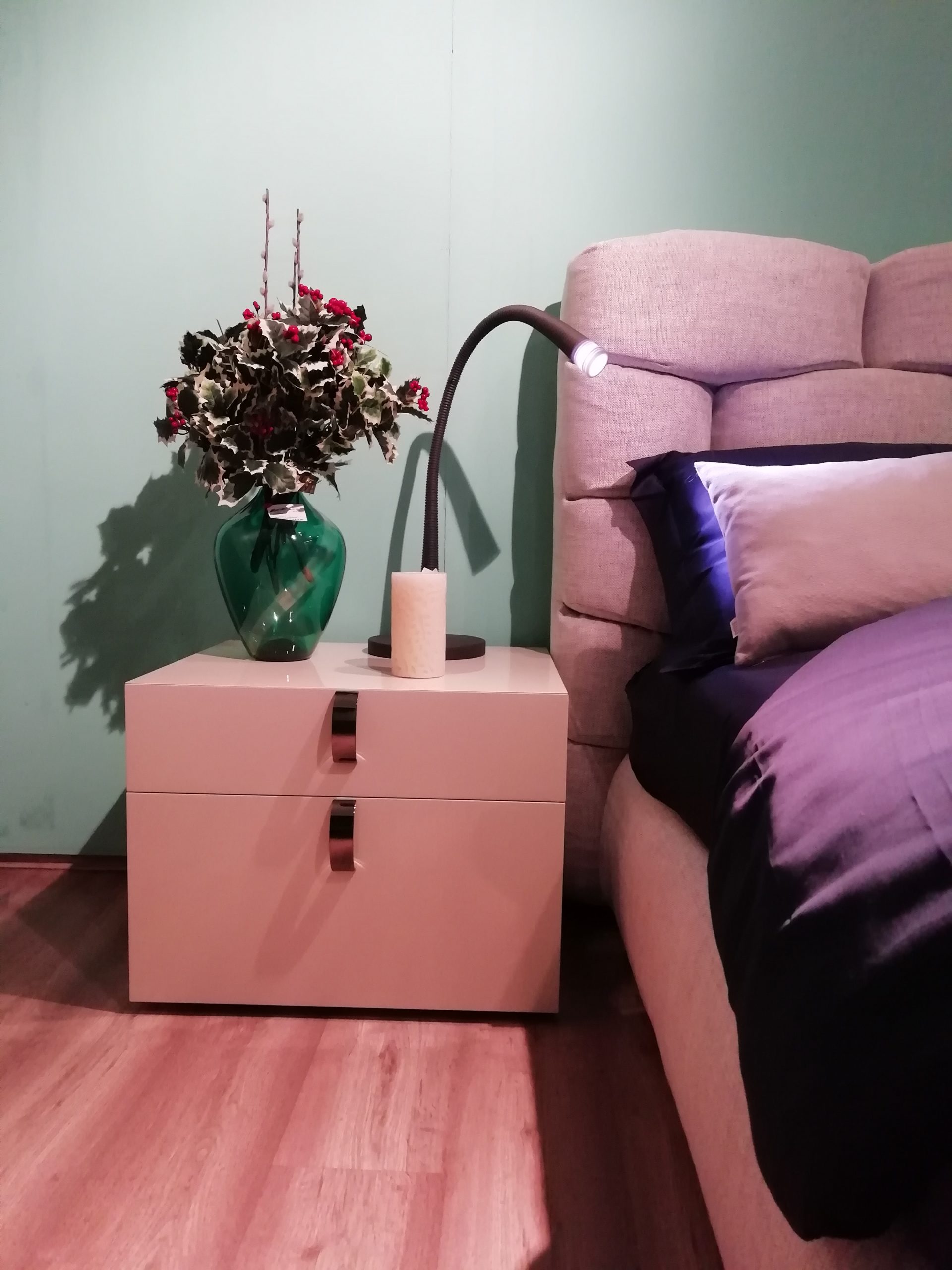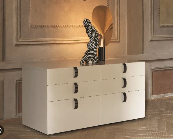 Groupe commode et deux tables de chevet couleur crème, avec une finition laqué brillant. Les tiroirs dotés de retour, sont finis à l’intérieur et utilisent une aide de guidage de haute résistance. Les poignées sont nickel noir.