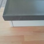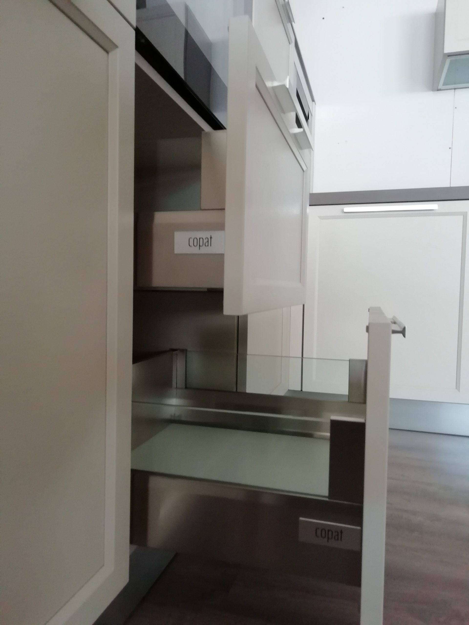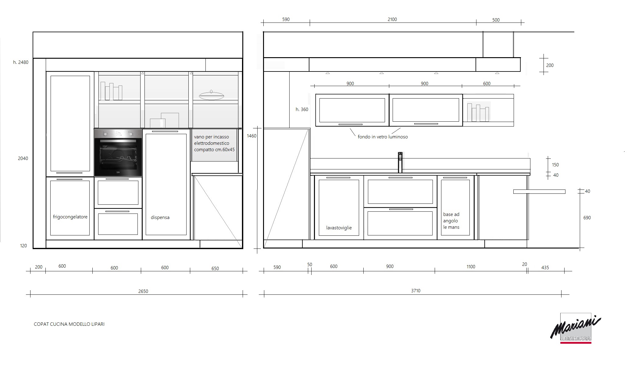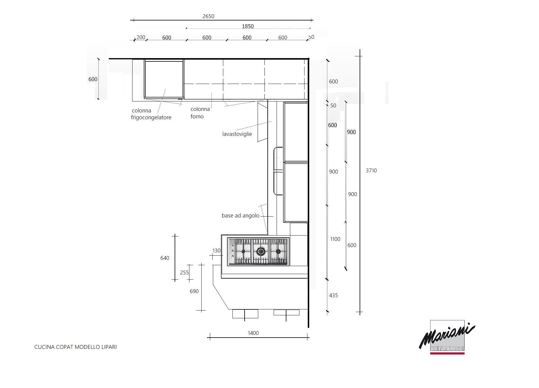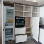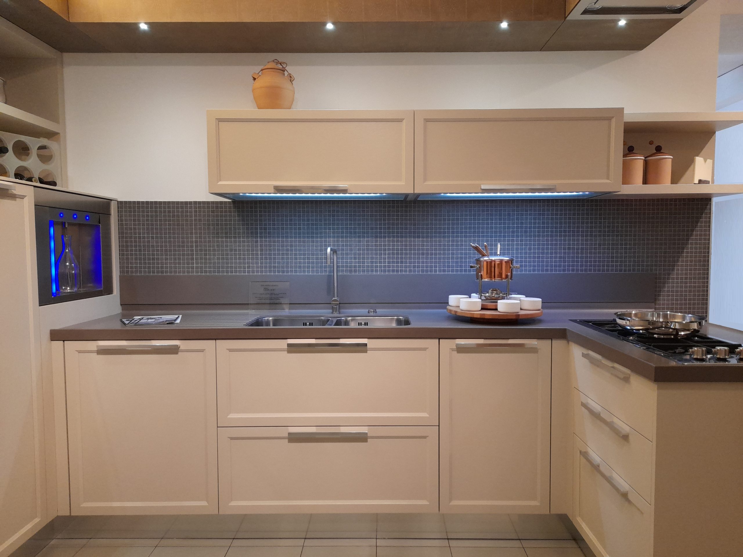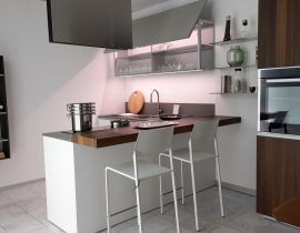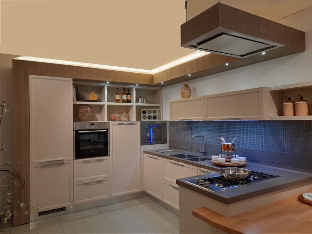 composition d’angle cm. 265 / 371 / 140 x 62 x 248h complet avec: meubles avec façades et côtés laqués mat à pores ouverts, structure en éco-ciment avec hotte Silfim, plans de travail en Corian et hêtre lamellaire.