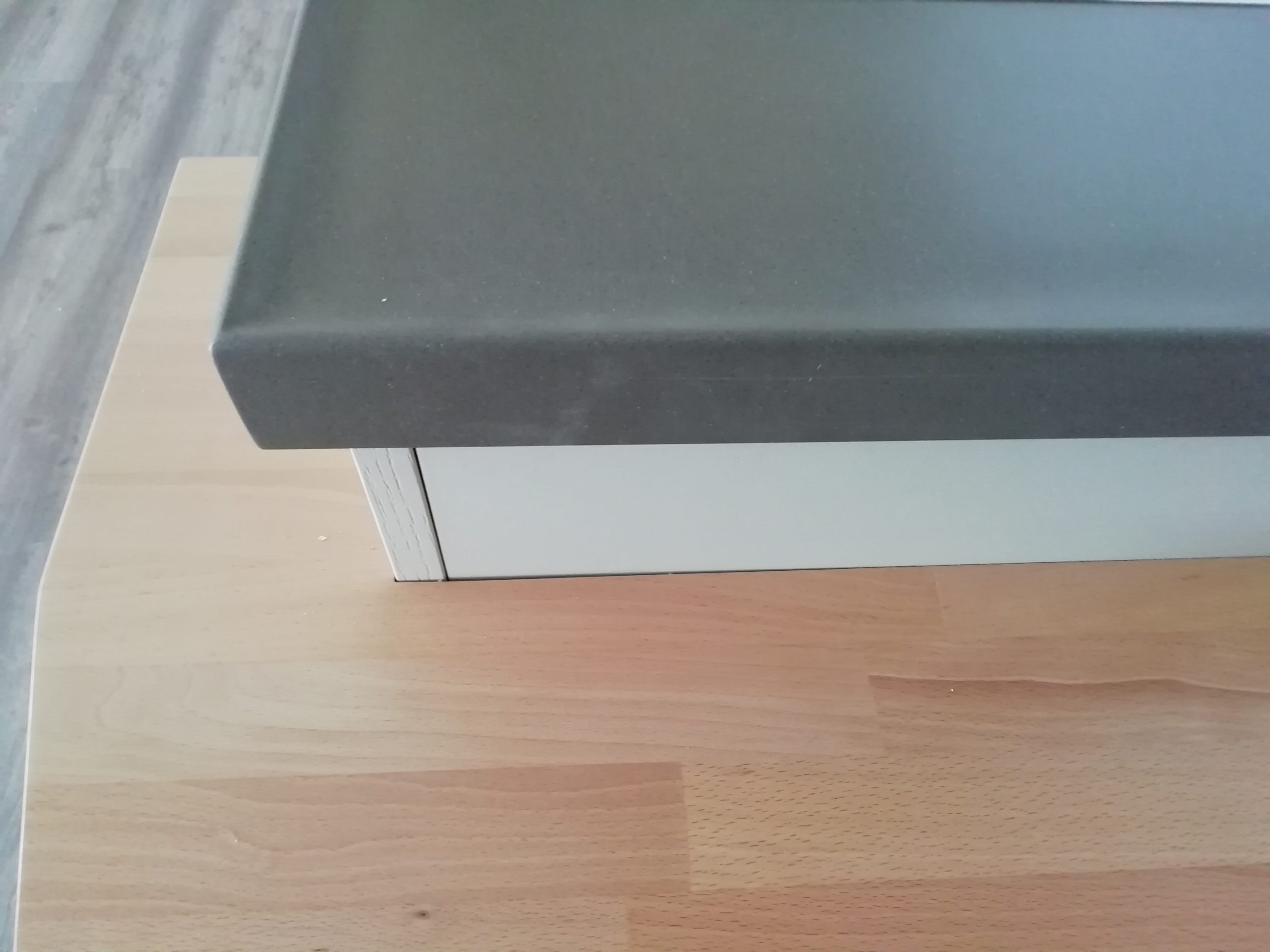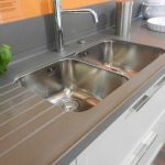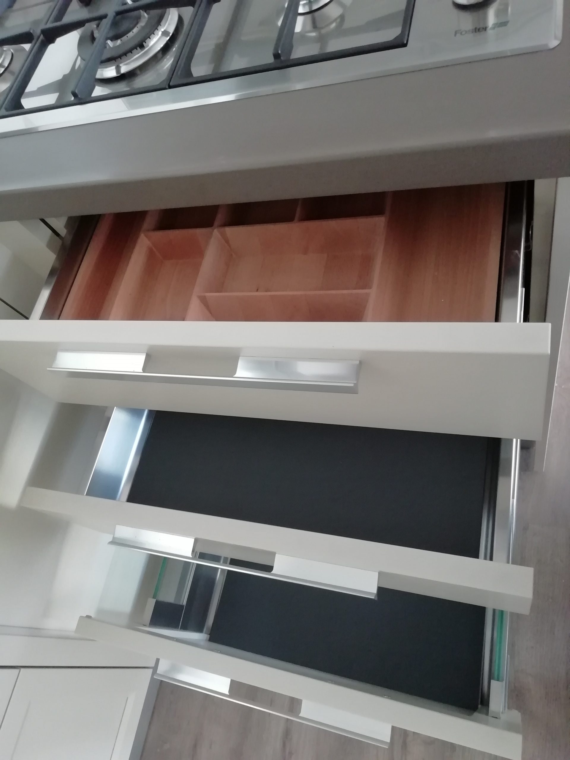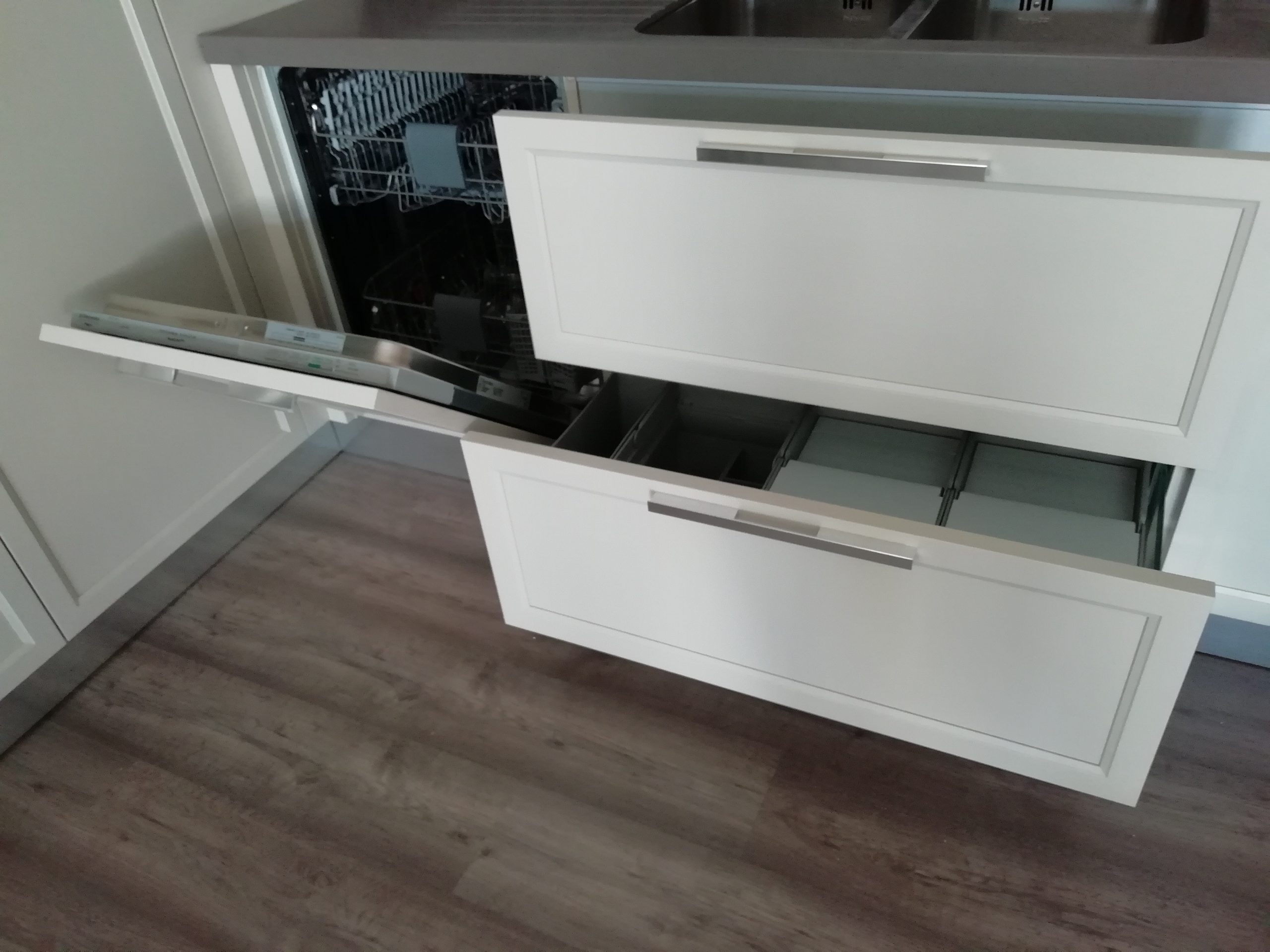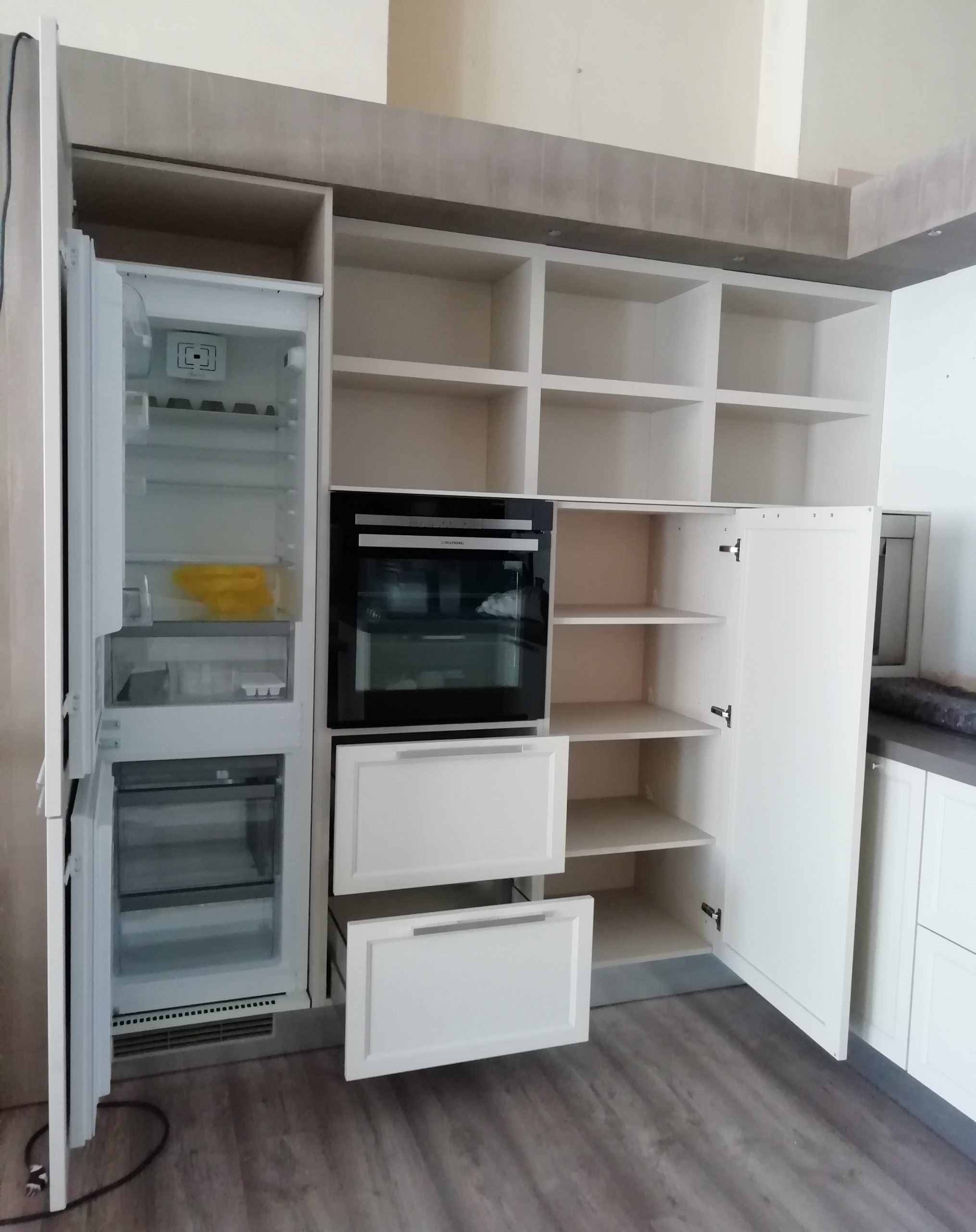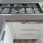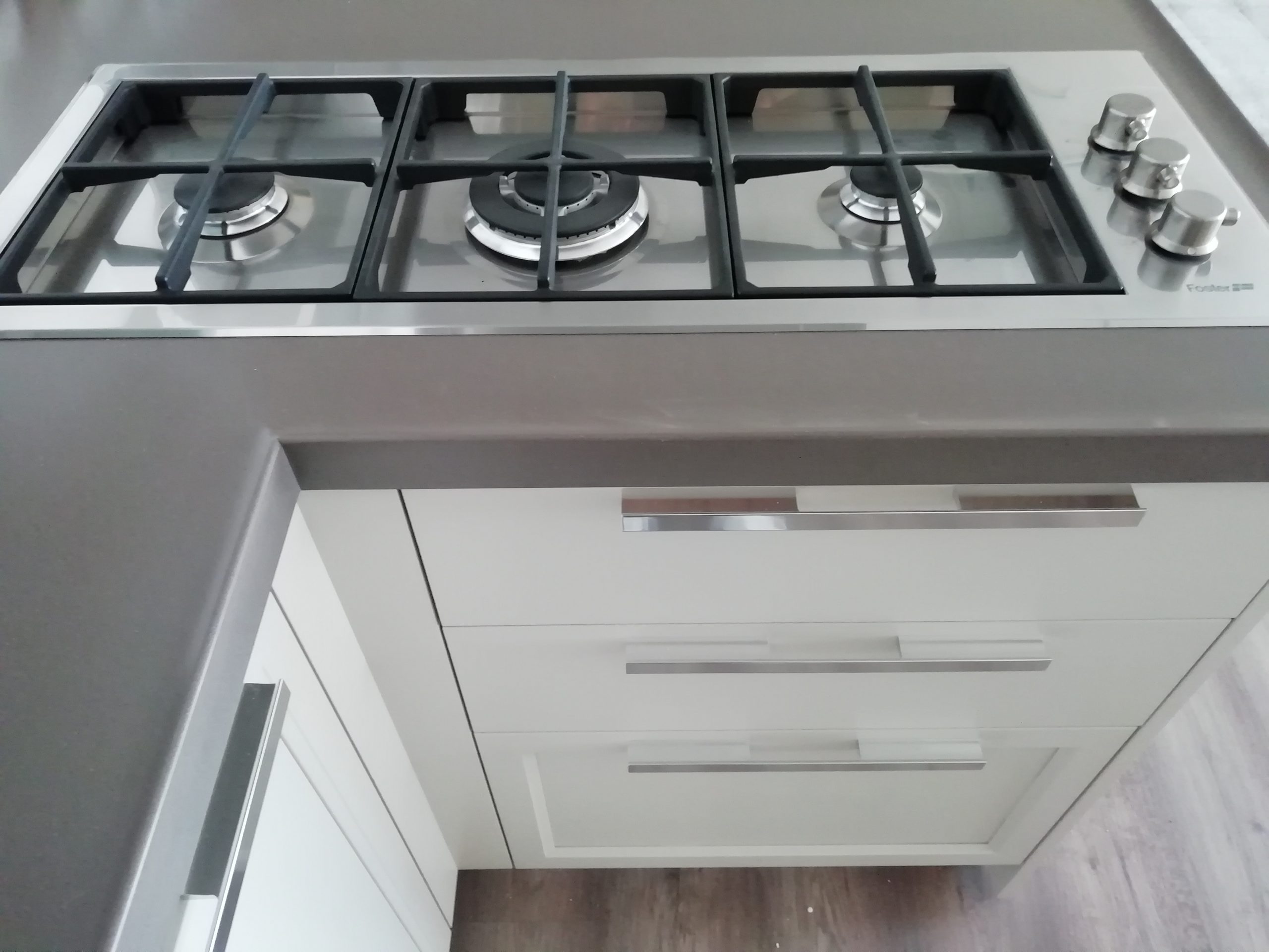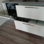 Appareils : réfrigérateur Whirlpool, lave-vaisselle Rex, évier sous plan Foster 2V, robinet mélangeur, plaque de cuisson Foster – DISTRIBUTEUR D’EAU ET FOUR EXCLU