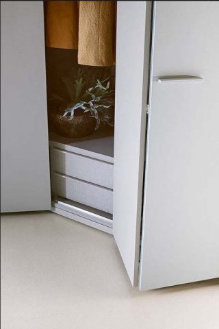 Nella collezione Armadio al Centimetro, Liscia, caratterizzato ad un’estetica essenziale, è il più versatile, pensato per progetti “sartoriali”: riducibile a misura in altezza, larghezza e profondità è inoltre disponibile per soluzioni ad angolo e per colonne terminali. Le ante sono disponibili con apertura battente, scorrevole, pieghevole o tagliate con inclinazione a richiesta secondo specifiche necessità progettuali. Ricchissime attrezzature interne offrono inoltre molteplici combinazioni per ogni esigenza di ordine: cassettiere, porta pantaloni, porta cinture, porta scarpe. Ripiani e barre appendiabiti con luce integrata. Senza dimenticare preziosi dettagli in cuoio e tessuto come i tappetini per i cassetti e le scatole per i vani porta camicie.