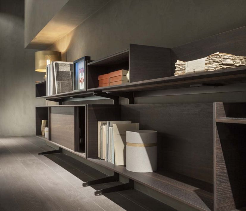Dettagli: serie di mobiletti a parete in rovere termotrattato con sostegni in metallo color bronzo, caratterizzati da vani aperti o chiusi con ante scorrevoli e maniglie in metallo.