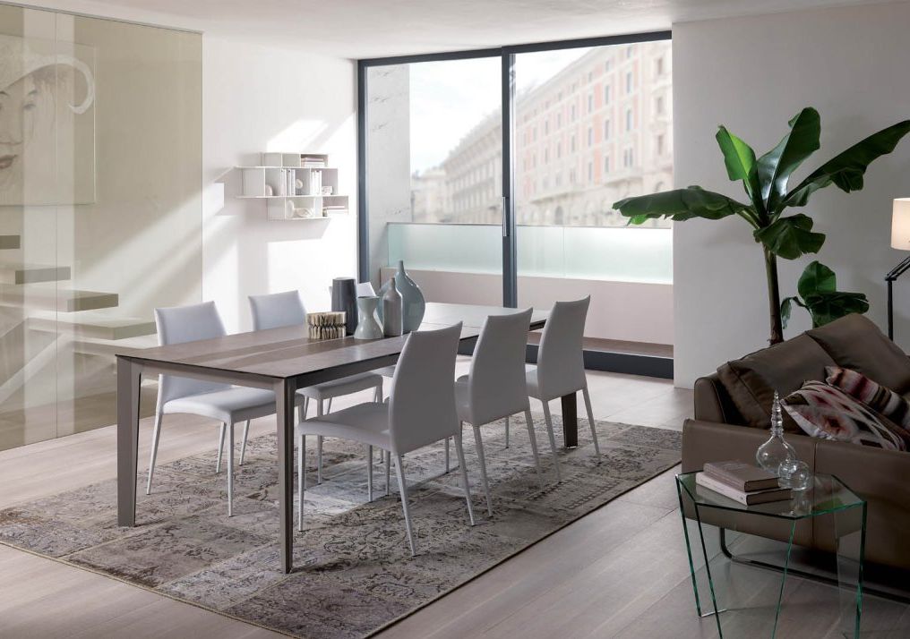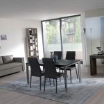 Dettagli: Tavolo da pranzo allungabile anche nella struttura, meccanismo telescopico in alluminio, un’allunga interna a libro, piani in cristallo. Struttura verniciata.