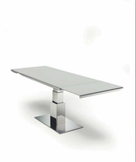 Tavolino trasformabile, struttura in alluminio/acciaio “Mirror”, meccanismo elettrico regolabile in altezza da cm. 43 a cm. 82, piano ed allunghe laterali in cristallo, disponibile con kit-led optional.