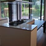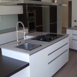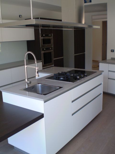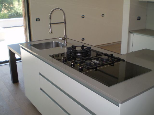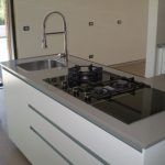 Nell’isola centrale abbiamo inserito un lavello ad una vasca montata filo top di servizio ai fuochi, una serie di tre piani cottura a domino: un fuoco tripla corona a gas, due fuochi medi a gas e due zone di cottura ad induzione.