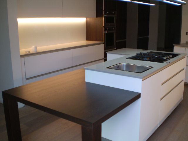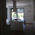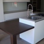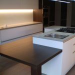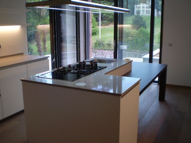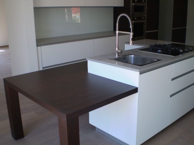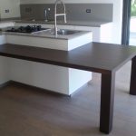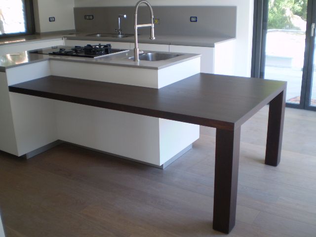Su due lati dell’isola abbiamo realizzato, nella nostra falegnameria, un tavolo sagomato ad “L” in rovere alto cm.75 per essere utilizzato con le sedie anzichè con gli sgabelli. A completamento la cappa aspirante in acciaio di cm. 175 x 60 .