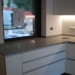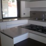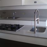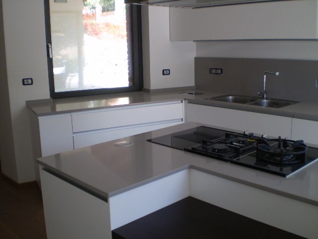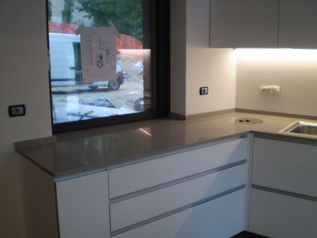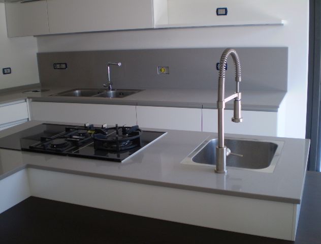 Il primo piano è stato realizzato inglobando il vano che normalmente sarebbe stato dedicato al davanzale, il secondo piano è stato lavorato con un angolo di 105,62° per essere perfettamente giuntato al primo e su quest’ultimo sono stati incassati il lavello a filo top e la pattumiera a pozzetto.