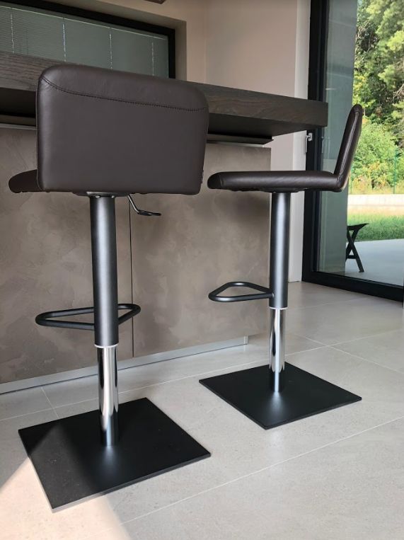 Come sedie e sgabelli abbiamo selezionato il modello Lunette di Ozzio; questo ci ha permesso di avere lo stesso rivestimento e la stessa estetica.