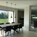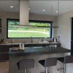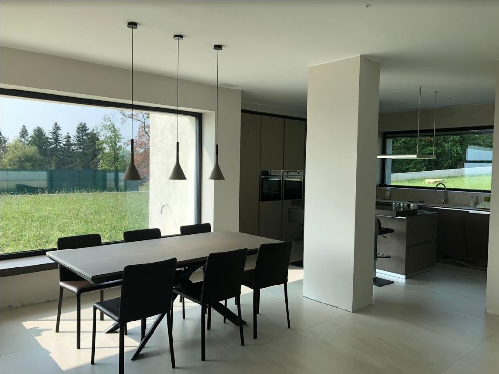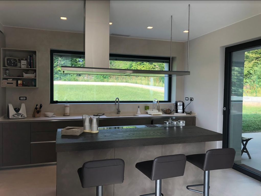 Il piano snack e la panca sono stati realizzati dalla nostra falegnameria nello stesso materiale. La panca, che corre lungo le finestre è stata realizzata su dima.