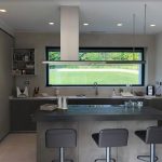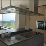 Le gole e gli zoccoli sono stati realizzati in acciaio con finitura brillantata a richiamare la cappa ad isola di Falmec modello Lumen, scelta nella versione asimmetrica e lunga cm.175×60 di profondità.