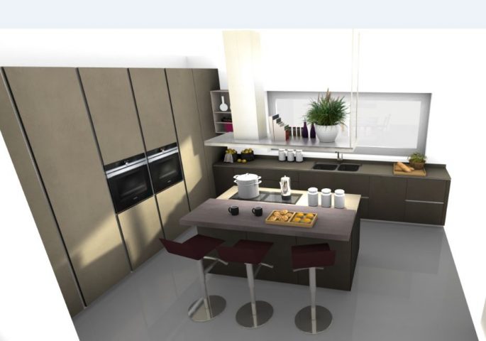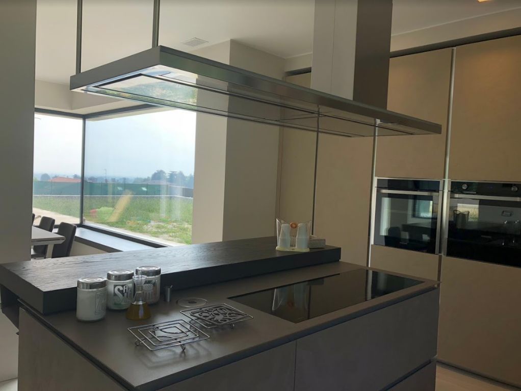 Come elettrodomestici sono stati scelti un frigocongelatore, un forno multifunzione con la funzione a vapore, un forno compatto combinato con microonde, un cassetto scaldavivande, una lavastoviglie a scomparsa , un piano cottura ad induzione con fuochi in linea ed una torretta estraibile con tre prese elettriche universali.