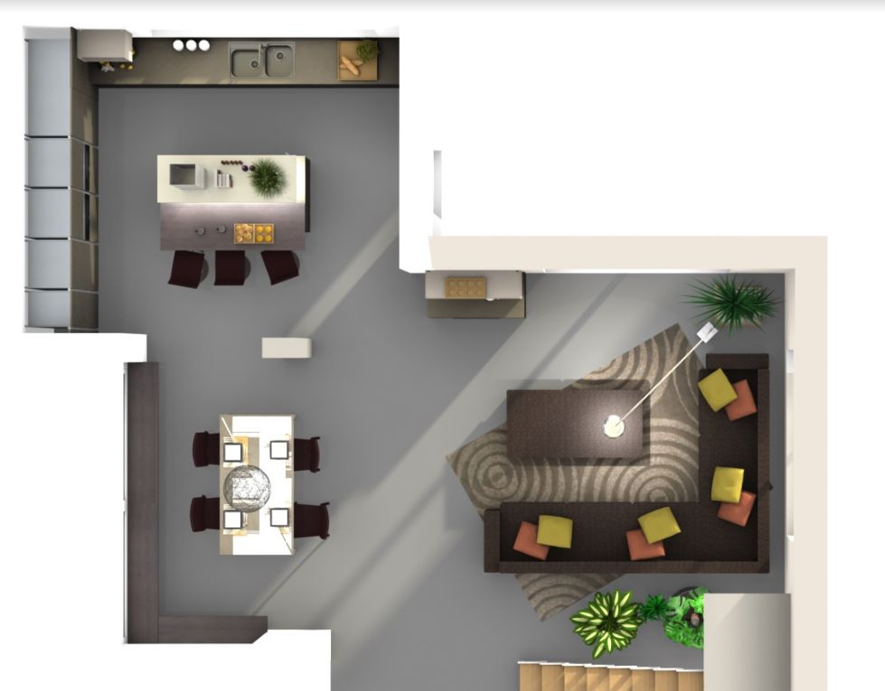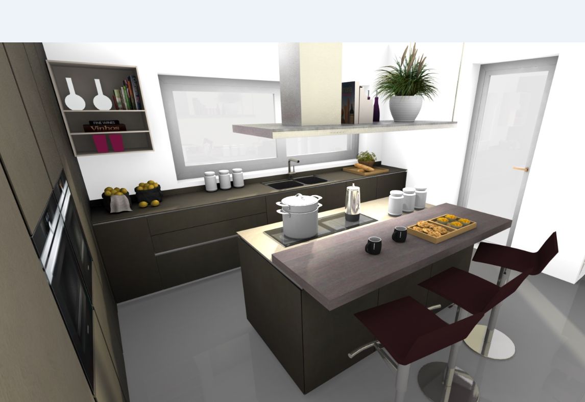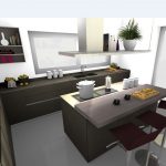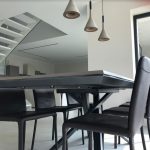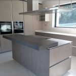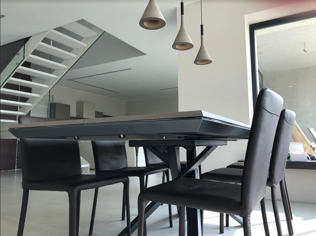 Il tavolo allungabile 4×4 di Ozzio scelto nella variante cemento colore tortora si abbina perfettamente al top dell’isola.