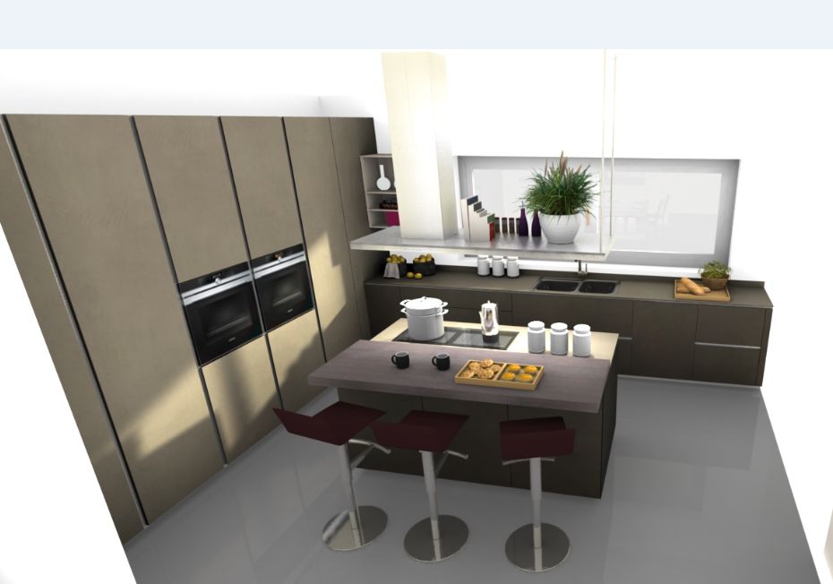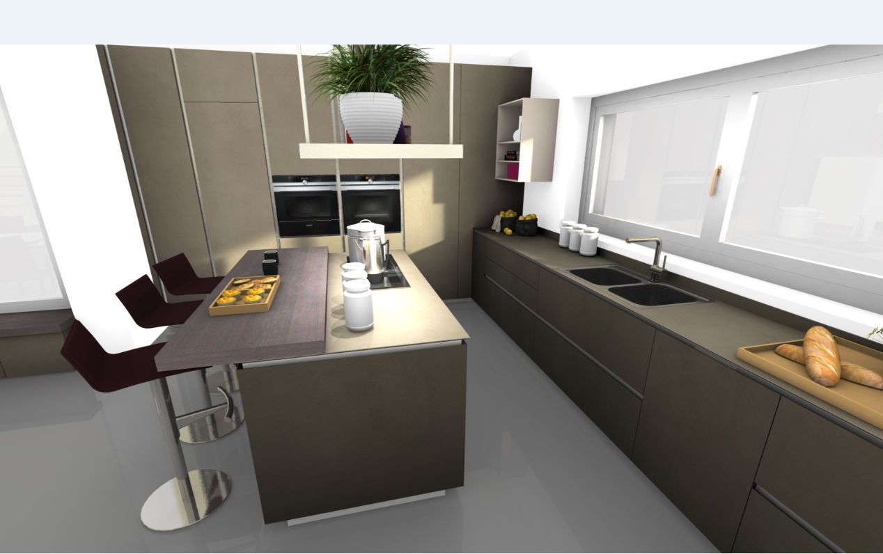Nelle scelte cromatiche effettuate si è deciso di realizzare la cucina in due colori: per le colonne la finitura arenaria, per le basi ed il top dell’isola la finitura castagna che abbinate al top in Corian® in finitura bone (un bianco caldo) ed allo snack realizzato in rovere tinto grigio vintage donano alla cucina un’atmosfera calda e accogliente.