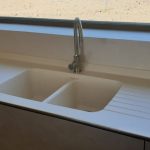 Un altro elemento di particolare rilievo della progettazione è il top in Corian® di cm.465 realizzato in un pezzo unico (senza giunte) con lavello a due vasche integrato, gocciolatoio inciso a disegno ed alzatine raccordate curve (foto 16).