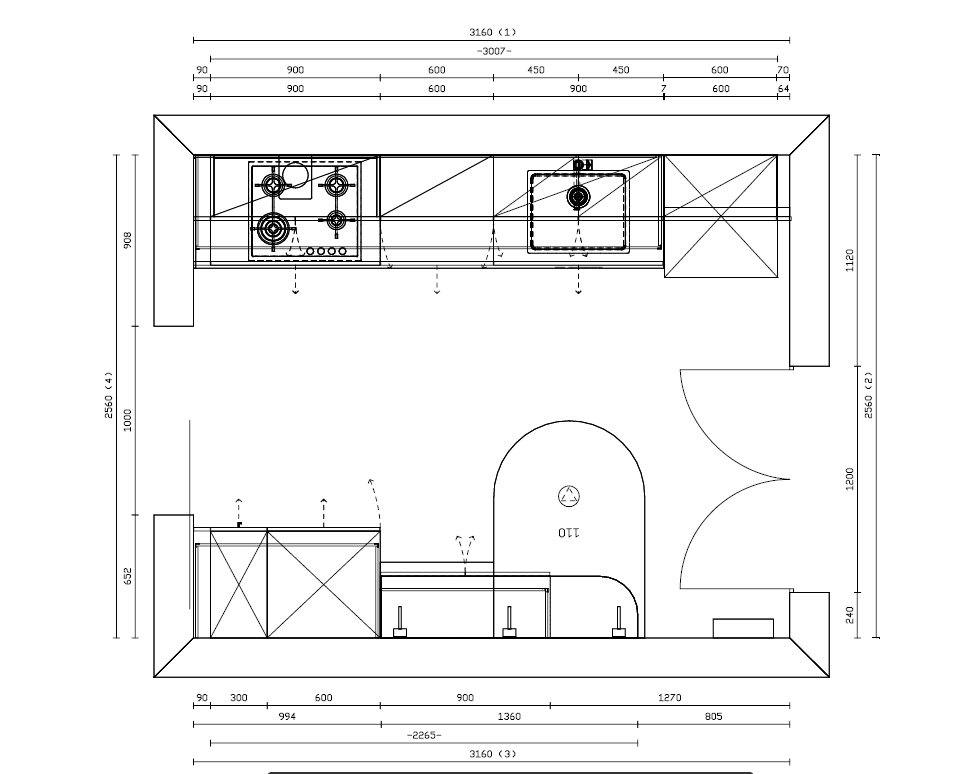 Sul lato opposto, partendo da dx, abbiamo lasciato un agio di circa cm.10 per lo scorrimento della porta dopodichè abbiamo posizionato una colonna di cm. 30 x 213 h con anta estraibile, una colonna forno attrezzata con cestoni e delle basi con anta di cm. 60 x 35 profondità che sorreggono il piano della penisola creato ed ottimizzato ad hoc per le misure dell’ambiente. La curva e la gamba centrale ne alleggeriscono l’estetica e ne consentono l’utilizzo con le sedie. Sulla parete, sopra le basi di profondità ridotta, abbiamo inserito due mensole con terminale sinistro curvo come la penisola.