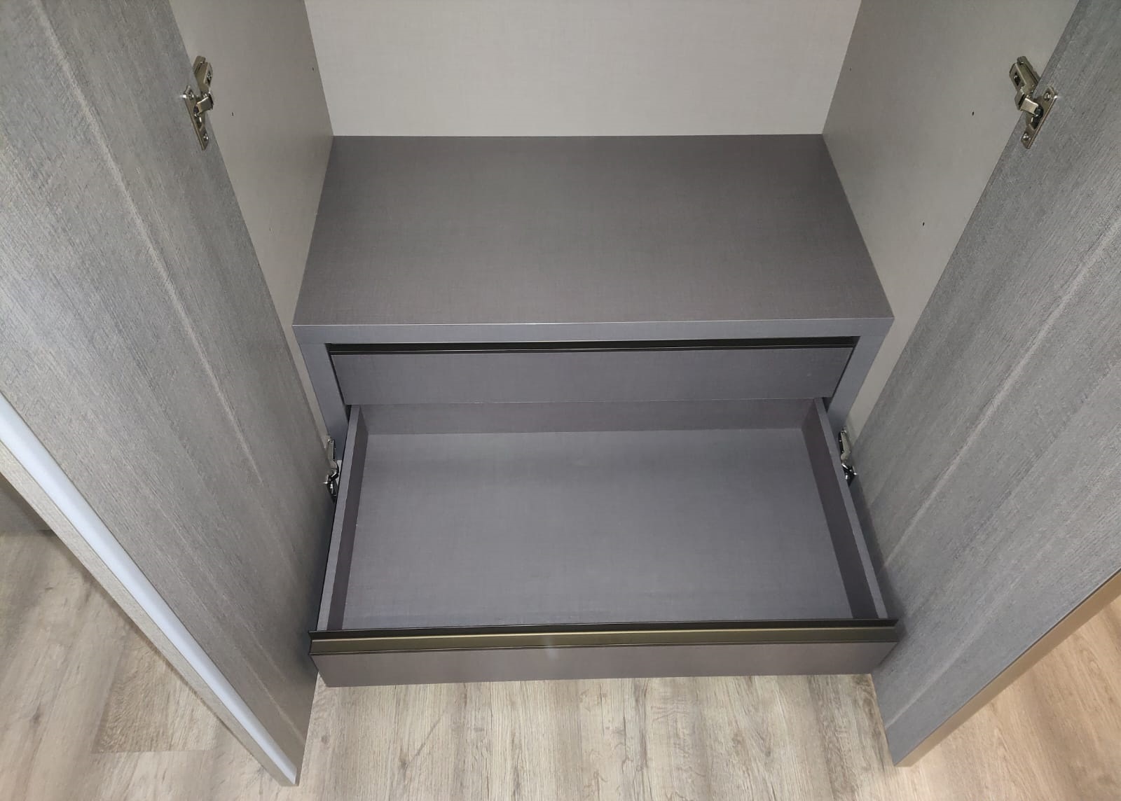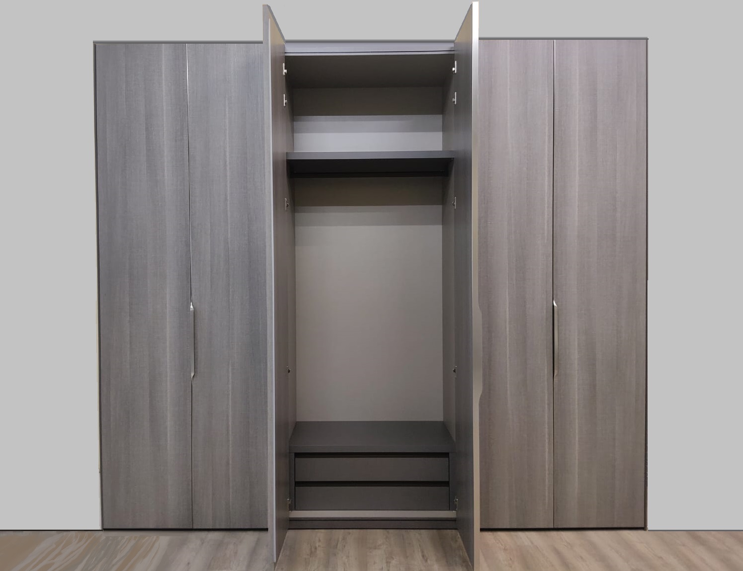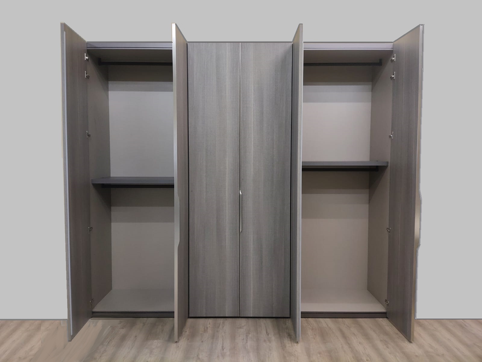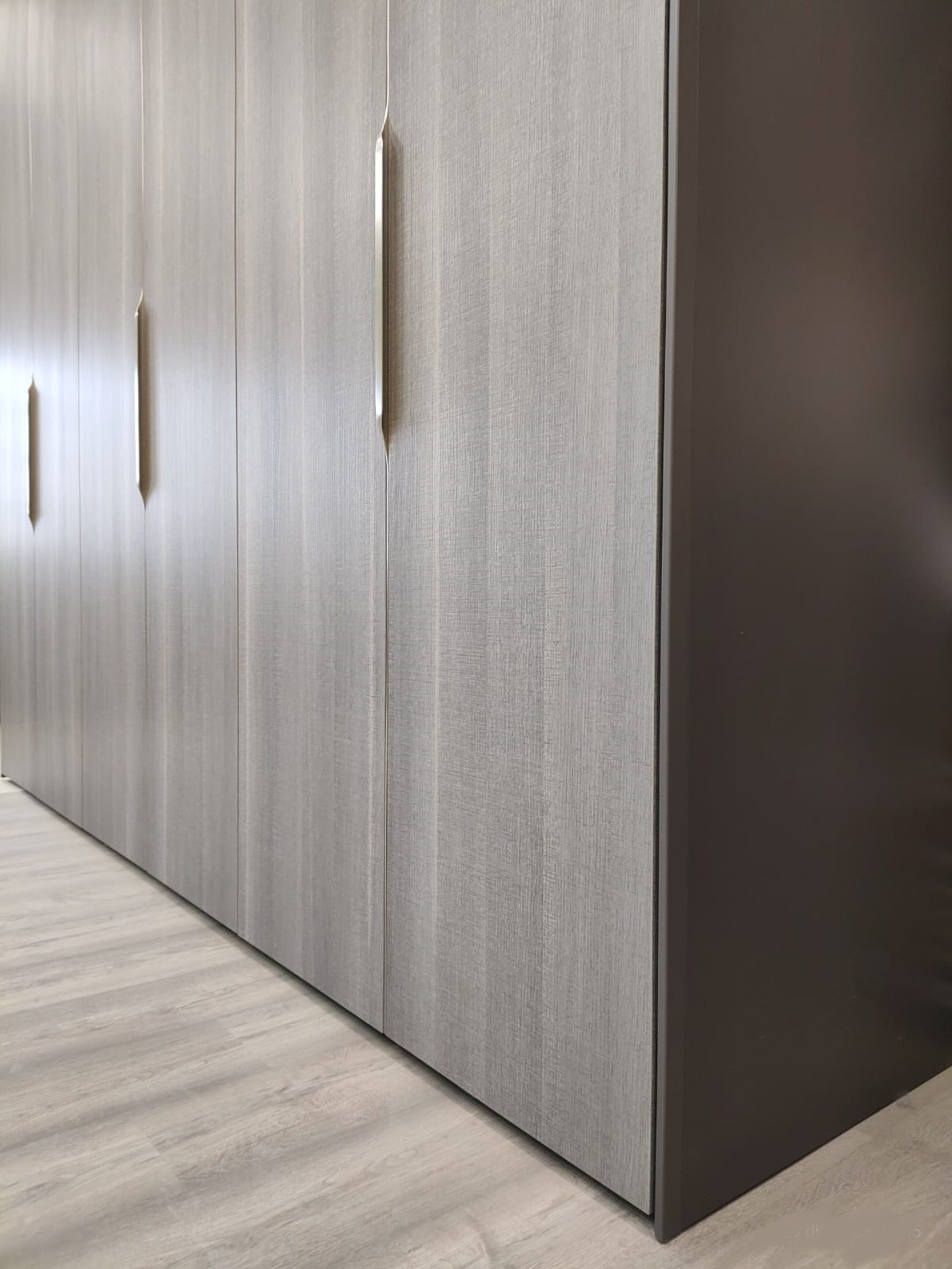 La superficie termostrutturata a rilievo in colore Grey dell’armadio Epoque di Flou non solo offre un aspetto moderno, ma è anche resistente. Le ante alte 259 cm, con cinque cerniere dotate di effetto decelerante, garantiscono una chiusura morbida e silenziosa, il che è un grande vantaggio.