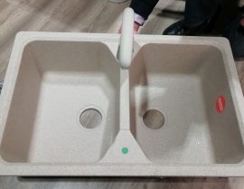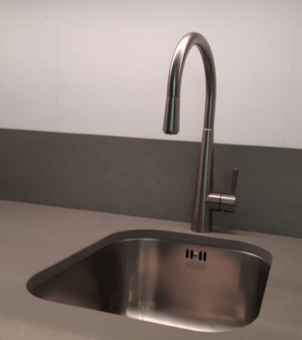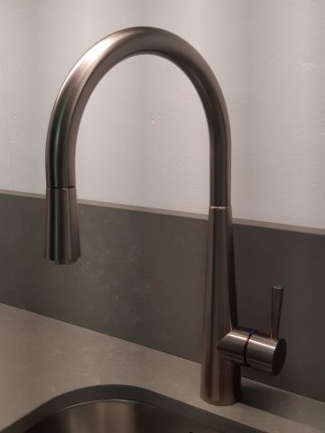 Miscelatore Monocomando per lavello, canna girevole e doccetta estraibile monogetto con valvola antigocciolante e rotazione della canna 170°.