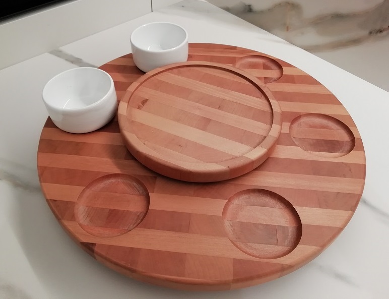 Vassoio Rotante in Legno Listellare di Faggio: Questo elemento non solo conferisce un aspetto elegante e caldo al tuo tavolo, ma permette anche una facile accessibilità alle ciotole per tutti i commensali.