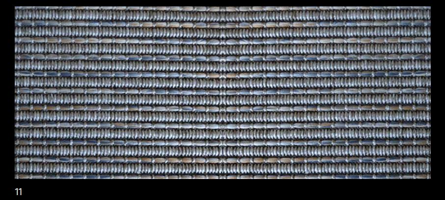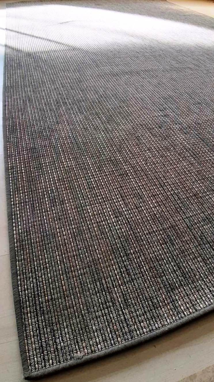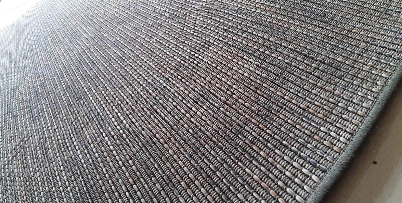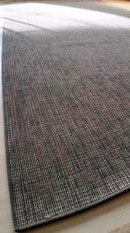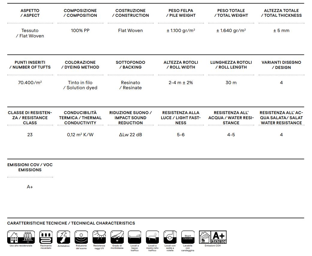 100 % PP, rifinito a mano, sottofondo resinato, peso totale 1.640 gr/mq, spessore 5 mm.