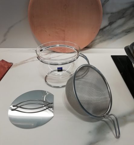 Materiali: vetro borosilicato resistente al calore, acciaio inox