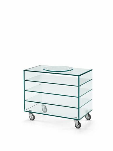 Elementi in vetro sovrapponibili o fissi con base dotata di ruote gommate, realizzati in diverse misure di larghezza.