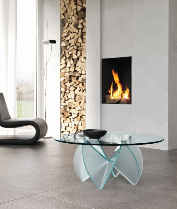 Il piano è in vetro, per un effetto decorativo a tutto tondo, grazie ai due elementi accostati che compongono la base.