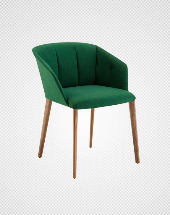 La seconda versione della poltroncina Liza prevede le gambe in massello di rovere verniciato, colore naturale o in noce Canaletto colore naturale.