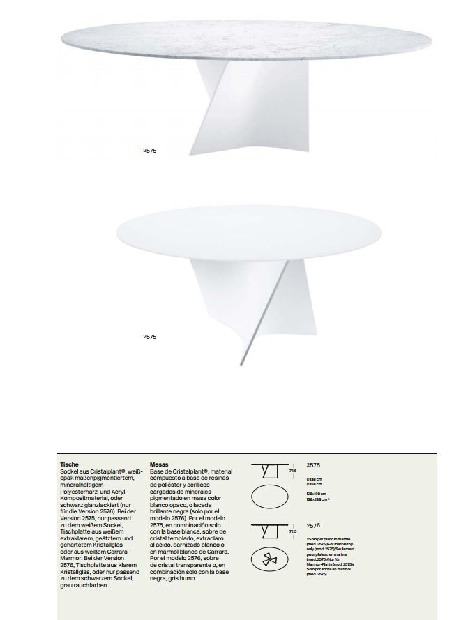 Il tavolo Elica è disponibile anche con basamento in Cristalplant® in colore bianco opaco o laccato nero. Piano in cristallo, spessore 12 mm. trasparente oppure fumé grigio in abbinamento solo con base nera.